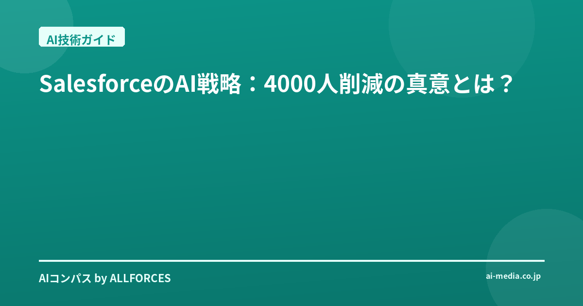 SalesforceのAI戦略:4000人削減の真意とは? 「SalesforceがAIで4000人削減」――このニュースを聞いて、あなたも少し驚いたんじゃないでしょうか?正直なところ、私も最初は「またか」と、少し身構えました。AIが雇用に与える影響については、これまでも散々議論されてきましたからね。でも、今回のSalesforceの動きは、単なるコストカット以上の、もっと深い意味を持っているように感じています。 私がこの業界で20年近くAIの進化を見てきた中で、こんな話は初めてではありません。新しい技術が導入されるたびに、業務の効率化が進み、一部の仕事がなくなるのは避けられない現実です。しかし、同時に新しい仕事が生まれ、より付加価値の高い業務へとシフトしていくのも、また歴史が証明してきたことです。今回のSalesforceの発表は、まさにその転換点に私たちが立っていることを改めて突きつけている、そう感じています。 SalesforceのCEO、マーク・ベニオフ氏がポッドキャスト番組「The Logan Bartlett Show」で語ったところによると、同社のカスタマーサポート部門では、AIエージェントの導入によって人員が9,000人から5,000人にまで減少したというんです。実に4,000人もの削減。これはインパクトが大きいですよね。彼らが開発したAIプラットフォーム「Agentforce」が、顧客対応の約50%を処理していると説明されています。つまり、AIが人間のオペレーターの半分の仕事を肩代わりしているわけです。 これは、AIが単なるツールではなく、業務プロセスそのものを再構築する「エージェント革命」の始まりを意味しています。
