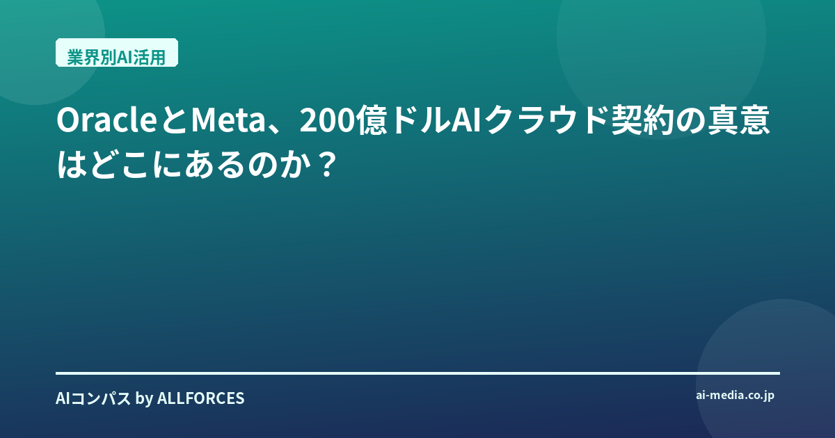 OracleとMeta、200億ドルAIクラウド契約の真意はどこにあるのか? 正直なところ、このニュースを聞いた時、私は思わず「またか!」と声に出してしまいました。OracleとMetaが200億ドル規模のAIクラウド契約を結ぶかもしれない、という話。あなたも感じているかもしれませんが、この金額、尋常じゃないですよね?一体、何がそこまで彼らを突き動かしているのでしょうか。 私がこの業界で20年、シリコンバレーのガレージから日本の大企業の役員室まで、数えきれないほどのAI導入を見てきましたが、これほどまでに「計算資源」が戦略の中心に据えられた時代は初めてかもしれません。かつてはソフトウェアが主役で、ハードウェアはそれを動かすための脇役でした。しかし、今やNvidiaのGPUがなければ、最先端のAIモデル、例えばMetaが開発を進めるLlama AIモデルのようなものは、絵に描いた餅でしかない。この現実が、今回の巨額契約の背景にあると私は見ています。 今回の契約の核心は、MetaがAI開発の生命線である計算資源を、いかに安定的に、そして戦略的に確保しようとしているか、という点に尽きます。MetaはこれまでもMicrosoft Azureのような既存のクラウドプロバイダーと連携してきましたが、AIモデルの規模が爆発的に拡大する中で、単一ベンダーへの依存はリスクでしかありません。Facebook、Instagram、WhatsAppといった巨大プラットフォームを支えるAIの進化を止めるわけにはいかない。だからこそ、彼らはクラウドプロバイダーの多様化を図り、Oracle Cloud Infrastructure(OCI)に目をつけたのでしょう。これは単なるコスト削減の話ではなく、AI時代のサプライチェーン強靭化、とでも言うべき動きです。 一方、Oracleにとっても、これはまさに千載一遇のチャンスです。長らくエンタープライズ領域のデータベースやアプリケーションで盤石な地位を築いてきた彼らが、AIインフラ市場で一気に存在感を高める。最近報じられたOpenAIとの3000億ドル規模の契約(これは本当に驚きでしたね!)に続き、Metaとの200億ドル契約が実現すれば、OracleはAI時代の新たな「インフラの巨人」としての地位を確固たるものにするでしょう。彼らが現在の会計年度で350億ドルもの設備投資を計画しているという話も、このAIインフラへの本気度を物語っています。彼らは、AIが未来のビジネスの基盤となることを誰よりも早く見抜き、そこに巨額の投資を惜しまない覚悟を決めた。このスピード感と決断力は、日本の多くの大企業が見習うべき点だと、個人的には強く感じています。 では、この動きは私たち投資家や技術者にとって何を意味するのでしょうか?投資家の皆さんには、AI関連銘柄を見る際に、単にAIモデルを開発している企業だけでなく、そのモデルを動かす「インフラ」を提供する企業にも注目してほしい。Nvidiaはもちろんのこと、Oracleのようなクラウドプロバイダーの動向は、今後の市場を占う上で非常に重要です。そして技術者の皆さん。クラウドの知識、特にGPUを活用した分散コンピューティングのスキルは、今後ますます価値が高まります。特定のクラウドに縛られず、複数のクラウド環境を使いこなせる「マルチクラウド」の知見は、あなたの市場価値を飛躍的に高めるはずです。AIモデルの進化だけでなく、それを支えるインフラ技術の深掘りも、これからのキャリアを考える上で不可欠だと私は思います。 このOracleとMetaの契約は、AI業界が新たなフェーズに入ったことを象徴しているように感じます。かつては「データは新しい石油」と言われましたが、今や「計算資源は新しい電力」とでも言うべきでしょうか。この電力争奪戦は、まだ始まったばかり。次にどんな企業が、どんな形でこの戦いに加わってくるのか、そしてそれが私たちの未来をどう変えていくのか、あなたはどう考えますか? この電力争奪戦は、まだ始まったばかり。次にどんな企業が、どんな形でこの戦いに加わってくるのか、そしてそれが私たちの未来をどう変えていくのか、あなたはどう考えますか? 正直なところ、OracleとMetaの動きは、水面下で激化しているAIインフラ競争の氷山の一角に過ぎないと私は見ています。AWS、Google Cloud、Microsoft Azureといった既存の巨大クラウドプロバイダーが、この状況をただ指をくわえて見ているはずがありません。彼らはすでに、AI向けに最適化されたGPUインスタンスの拡充、独自のAIアクセラレーター開発、そして大規模なデータセンター投資を加速させています。MicrosoftがOpenAIと深く連携し、Azureをその主要なインフラとして提供しているのは、まさにその最たる例でしょう。Googleもまた、TPUという独自のAIチップを開発し、その計算資源を自社のAIモデルだけでなく、外部の顧客にも提供することで、この「電力」市場での存在感を高めようとしています。 この競争が激化すればするほど、AIインフラの選択