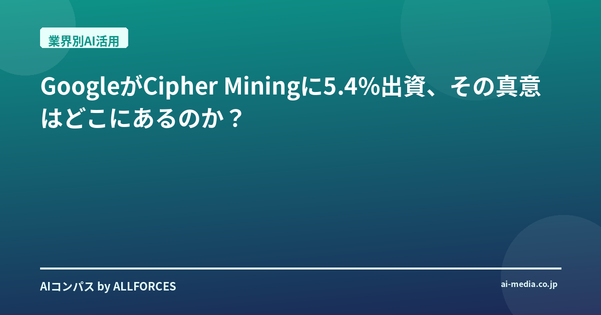 GoogleがCipher Miningに5.4%出資、その真意はどこにあるのか? 正直なところ、このニュースを最初に聞いた時、私も少しばかり驚いたよ。Googleがビットコインマイニング企業であるCipher Miningに5.4%も出資するなんて、一体どういうことだろう?あなたも同じように感じたかもしれないね。長年この業界を見てきた私からすると、一見すると意外な組み合わせに見えるけれど、深く掘り下げてみると、これはAI時代の新たなインフラ戦略の一端が見えてくる、非常に興味深い動きなんだ。 考えてみてほしい。AI、特に最近の生成AIや大規模言語モデル(LLM)の進化は目覚ましいものがあるけれど、その裏側で何が起きているか。そう、膨大な計算能力と、それを支える莫大な電力消費だ。データセンターの電力問題は、私がこの業界に入った20年前からずっと議論されてきたテーマだけど、AIの登場でその重要性は桁違いに増している。かつては「データは新しい石油だ」と言われたけれど、今や「電力は新しいデータだ」と言っても過言ではないかもしれない。Google自身も、自社開発のTPU(Tensor Processing Unit)やGoogle Cloudを通じて、AIインフラの最前線を走っている企業だからこそ、この電力と計算能力への渇望は誰よりも理解しているはずだ。 今回の投資の核心は、単なる財務的なものではないと私は見ている。Googleは、AIクラウドプラットフォームのFluidstackとの間で10年間で30億ドル、延長オプションを含めると最大70億ドルにもなる契約を結んでいる。この契約において、GoogleがFluidstackの財政的義務のうち14億ドルを保証する代わりに、Cipher Miningの株式約2,400万株のワラントを取得したという構図だ。つまり、Googleは直接的な現金投資だけでなく、保証という形でCipher MiningのAIインフラ拡張を間接的に支援し、その見返りとして株式を得ているわけだね。 Cipher Miningは、もともとビットコインマイニングのために産業規模のデータセンターを建設・運営してきた企業だ。テキサス州に4つのデータセンターを持ち、合計327MWの施設と15.7EH/sのハッシュレート容量を誇っている。さらに、テキサス州には2.8GWものパイプラインも保有しているというから、その規模は相当なものだ。彼らは、最適化されたエネルギー調達とサイト選定のための独自の技術と戦略的パートナーシップを持っていて、運用効率とコスト管理に長けている。 この投資のポイントは、Cipher Miningがその既存のインフラとノウハウを、ビットコインマイニングから高性能コンピューティング(HPC)ホスティング、そして最終的にはAIコンピューティングへとシフトさせている点にある。実際、Cipher Miningはテキサス州の施設から168メガワットのコンピューティング能力をAI運用に提供する予定だという。これは、AIと暗号マイニングの融合という、業界の広範なトレンドを象徴する動きと言えるだろう。 Googleの戦略としては、自社でゼロから大規模なデータセンターを建設するのではなく、すでに大規模な電力インフラと運用ノウハウを持つCipher Miningのような企業と提携することで、AIコンピューティング能力を迅速かつ効率的に確保しようとしているように見える。これは、AI開発競争が激化する中で、時間とコストを節約し、市場投入までのスピードを上げるための賢明な判断だと私は評価しているよ。特に、半導体不足やサプライチェーンの問題が続く中で、既存の施設を転用できるメリットは大きい。 投資家や技術者の皆さんには、この動きから何を読み取るべきだろうか。まず投資家としては、AI関連銘柄を見る際に、単にソフトウェアやモデル開発企業だけでなく、その裏側を支えるインフラ、特に電力とデータセンターに注目するべきだ。持続可能性や再生可能エネルギーへの取り組みも、長期的な視点で見れば重要な評価軸になるだろう。そして技術者としては、AIの進化がハードウェアやインフラに与える影響を常に意識しておく必要がある。エネルギー効率の高いアルゴリズムや、分散型コンピューティング、あるいは今回のケースのように、既存のインフラをAI向けに最適化する技術は、今後ますます重要になるはずだ。 このGoogleとCipher Miningの提携は、AIが社会のあらゆる側面に浸透していく中で、その基盤となるインフラがどのように再構築されていくのかを示す、1つの重要な事例だと私は考えている。ビットコインマイニングで培われた大規模な電力管理とデータセンター運用のノウハウが、AIの未来を支えることになるなんて、数年前には想像もしなかったことだ。あなたはこの動きから、AI時代のインフラの未来にどんな可能性を感じるだろうか? あなたはこの動きから、AI時代のインフラの未来にどんな可能性を感じるだろうか? 正直なところ、この問いに対する答えは1つではないし、非常に多岐にわたる。しかし、私がこの提携から強く感じるのは、AIの進化が、これまで異なる領域だと思われていた産業間の壁を打ち破り、新たなシナジーを生み出しているというこ