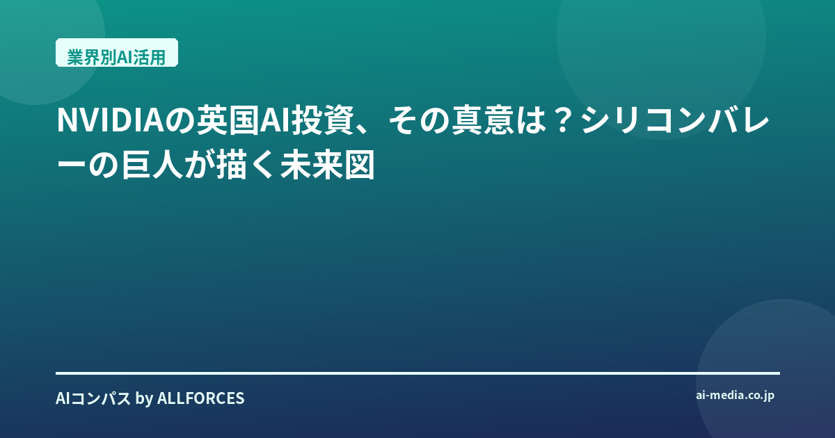 NVIDIAの英国AI投資、その真意は?シリコンバレーの巨人が描く未来図 「NVIDIAが英国AIに20億ポンド投資」――このニュースを聞いて、あなたはどう感じましたか?正直なところ、私自身、この手の巨額投資の発表にはもう慣れっこになっている部分もあります。AI業界を20年間も見ていれば、シリコンバレーのスタートアップが鳴り物入りで登場し、あっという間に消えていく様も、日本の大企業が鳴り物入りでAI導入を宣言し、数年後に「あれ、どうなった?」となるケースも、山ほど経験してきましたからね。でも、今回のNVIDIAの動きは、ただの投資話では終わらない、もっと深い意味があるように感じています。 考えてみれば、AIがこれほどまでに社会の基盤になるとは、20年前には想像もできませんでした。当時はまだ、AIはSFの世界の住人で、研究室の片隅で細々と進化を続けている技術でした。それが今や、私たちの生活のあらゆる側面に浸透し、産業構造そのものを変えようとしています。NVIDIAは、その変革の最前線で、常にハードウェアの進化を牽引してきました。彼らが英国という特定の地域に、これほど大規模なコミットメントをするというのは、単に市場を広げる以上の戦略的な意図があるはずです。 彼らの狙いは明確です。英国のAIスタートアップエコシステムを活性化し、新たな企業、雇用、そして世界的に変革をもたらすAIビジネスの創出を加速させること。英国は、オックスフォードやケンブリッジといった世界トップクラスの学術機関を擁し、AI研究の分野では常に最先端を走ってきました。しかし、超計算能力へのアクセス不足、ロンドン以外のベンチャーキャピタル(VC)の資金供給の偏り、エネルギーコストの上昇、そして主要な学術機関へのVCのアクセス困難といった課題も抱えていました。NVIDIAは、この投資を通じて、これらの課題を一気に解決しようとしているように見えます。 具体的に投資対象となっている企業を見ると、その戦略がより鮮明になります。自動運転技術のWayveにはNVIDIAから5億ドルの資金調達が別途発表されていますし、AIバイオテクノロジー分野のBasecamp ResearchやLatent Labsといったスタートアップにも注目が集まっています。これらの分野は、まさにAIが社会実装される上で最もインパクトの大きい領域ですよね。また、Accel、Air Street Capital、Balderton Capital、Hoxton Ventures、Phoenix Courtといった有力VCと連携することで、資金だけでなく、彼らが持つネットワークや知見も英国のスタートアップに注入されることになります。これは、単なる資金提供以上の価値を生み出すはずです。 そして、このNVIDIAの動きは、孤立したものではありません。MicrosoftやGoogle、OpenAIといった他の米国大手テクノロジー企業も、英国のAIインフラに総額310億ポンドを超える大規模な投資を行っており、これは「技術繁栄協定」の一部とされています。つまり、英国は今、世界のAI投資の最前線に立たされていると言っても過言ではありません。2026年までに12万個のBlackwell GPUを英国国内に展開し、欧州最大のGPUクラスターを構築する計画は、英国のAI処理能力を文字通り「桁違い」に引き上げるでしょう。 では、この状況は私たちに何を教えてくれるのでしょうか?投資家として見れば、GPUインフラ、自動運転、AIバイオテクノロジーといった特定のAI垂直統合分野に、今後も大きな成長機会があることは明らかです。特に、NVIDIAがこれほどまでにコミットしている領域は、彼らの技術ロードマップと密接に連動しているため、長期的な視点で見ても有望だと言えるでしょう。 技術者やスタートアップの皆さんにとっては、これはまさに千載一遇のチャンスです。最先端のGrace Blackwell Ultra GPUにアクセスできる環境が整うことで、これまで資金や計算能力の制約で実現できなかったような、野心的なプロジェクトに挑戦できる可能性が広がります。ロンドン、オックスフォード、ケンブリッジ、マンチェスターといった主要なハブに新たな資本とインフラが集中することで、これらの地域がAIイノベーションの新たな震源地となるかもしれません。 もちろん、すべての投資が成功するわけではありませんし、新しい技術には常に予期せぬ課題がつきものです。私自身、過去には「これは来る!」と確信していた技術が、結局は市場に受け入れられなかったケースも見てきました。しかし、NVIDIAの今回の投資は、単なる投機的なものではなく、英国のAIエコシステム全体を底上げし、長期的な視点でAIの未来を形作ろうとする、非常に戦略的な一手だと感じています。この動きが、今後どのようなイノベーションを生み出し、私たちの社会をどう変えていくのか、あなたも一緒に見守っていきませんか? NVIDIAの今回の投資は、単なる投機的なものではなく、英国のAIエコシステム全体を底上げし、長期的な視点でAIの未来を形作ろうとする、非常に戦略的な一手だと感じています。この動きが、今後どのようなイノベーションを生み出
