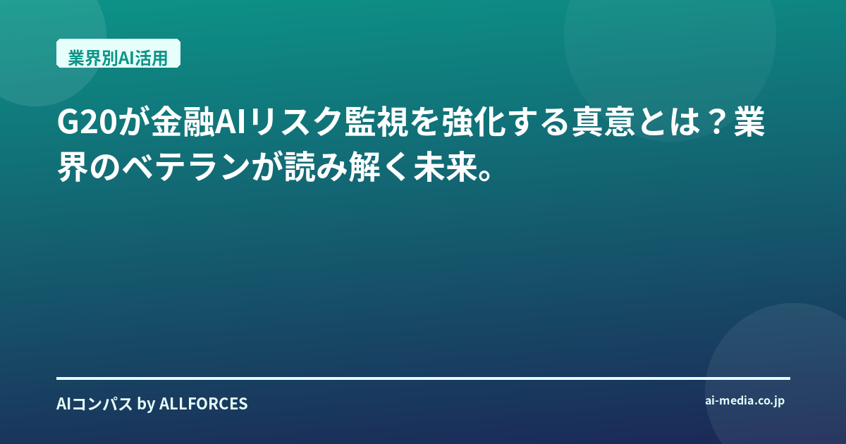 G20が金融AIリスク監視を強化する真意とは?業界のベテランが読み解く未来。 G20が金融AIのリスク監視強化に乗り出す、というニュースを聞いて、あなたはどう感じましたか?正直なところ、私は「ついに来たか」という印象でしたね。この動きは、AIが金融業界の奥深くまで浸透し、もはや無視できない存在になったことの証左だと感じています。 私がこの業界でAIの進化を20年間見守ってきた中で、初期のAIは特定のタスクを自動化する「ツール」に過ぎませんでした。しかし、Generative AI(生成AI)の登場以降、その役割は劇的に変化し、今や金融機関のバックオフィスからウェルスアドバイザリー、さらには市場分析に至るまで、あらゆる業務に深く関与しています。Goldman SachsやHSBCのような大手銀行が、すでに生成AIを積極的に導入しているのは、あなたもご存知の通りでしょう。 しかし、この急速な導入の裏には、見過ごせないリスクが潜んでいます。G20の金融安定理事会(FSB)や国際決済銀行(BIS)が警鐘を鳴らしているのは、まさにその点です。彼らが最も懸念しているのは、「システミックリスク」の増大。多くの金融機関が同じAIモデルや特定のハードウェアに過度に依存することで、もしそのモデルに欠陥があったり、外部のGenerative AIプロバイダー(例えば、AnthropicやCognitionのDevinのようなAIエージェントプラットフォームを提供する企業)に障害が発生したりすれば、金融システム全体に「群集行動」のような形でリスクが波及する可能性がある、というわけです。これは、クラウドサービスへの集中リスクと似た構造を持っていると言えるでしょう。 さらに、データギャップ、AIプロバイダーからの透明性の欠如、そしてAIモデルの進化の速さも、効果的なリスク追跡を阻む大きな要因だとFSBは指摘しています。そして、生成AIの進化は、金融詐欺や市場における偽情報の拡散といった新たな脅威も生み出しています。あなたも、最近のフェイクニュースの精巧さには驚かされているのではないでしょうか? では、具体的にどのような動きがあるのでしょうか。JPMorgan Chaseが2023年にテクノロジーに153億ドルもの巨額を投資し、900人以上のデータサイエンティスト、600人の機械学習エンジニア、200人のAI研究者を擁しているという数字は、彼らがAI開発とガバナンス強化にどれほど本気であるかを示しています。これは単なる流行りではなく、企業戦略の根幹をなすものなのです。 また、IBMはリスク管理、コンプライ