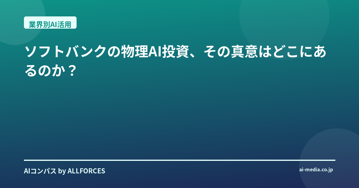 ソフトバンクのこの大胆な一歩は、AIが私たちの社会にどのように浸透していくのか、その未来の姿を大きく左右する可能性を秘めています。デジタルとフィジカルの融合が進む中で、私たちはどのような新しい価値を創造できるのでしょうか?そして、この壮大なビジョンは、本当に人類を進化させる画期的な進化を推進するのでしょうか?私自身、その答えを追い続ける日々です。 私自身、その答えを追い続ける日々です。では、この壮大なビジョンが現実のものとなった時、私たちの社会はどのように変わるのでしょうか? そして、その変革の道のりには、どのような課題が待ち受けているのでしょうか? ### 物理AIが拓く新たな産業と社会の姿 ソフトバンクが描く「フィジカルAI」の世界は、単に工場で働くロボットが増える、というレベルの話ではありません。それは、私たちがこれまで想像もしなかったような、新たな産業と社会の姿を私たちにもたらす可能性を秘めています。 個人的には、まず製造業における「多品種少量生産」の極限化が進むと考えています。現在の産業用ロボットは、特定のタスクを高速かつ精密にこなすことに特化していますが、タスクが変わればティーチング(プログラミング)し直す手間がかかります。しかし、AIの知性を持ったロボットは、環境の変化や新しい指示に自律的に適応し、柔軟に生産ラインを組み替えることができるようになるでしょう。これにより、消費者の個別のニーズに合わせたカスタマイズ製品を、大規模生産と同じ効率で提供できるようになるかもしれません。これは、製造業におけるゲームチェンジャーとなるはずです。 物流業界もまた、大きな変革の波にさらされるでしょう。現在、倉庫の自動化は進んでいますが、その先の配送、つまり「ラストワンマイル」はまだ人手に頼るところが大きいですよね。フィジカルAIは、ドローンや自律走行ロボットとして、複雑な都市環境や過疎地でも荷物を効率的かつ安全に届けることを可能にするでしょう。想像してみてください。あなたが注文した商品が、AIが最適ルートを判断し、障害物を避けながら、あなたの玄関まで届けられる未来を。これは、サプライチェーン全体の効率を劇的に向上させるだけでなく、過疎地域の生活を支えるインフラにもなり得ます。 さらに、医療や介護分野への応用も計り知れません。手術支援ロボットはすでにありますが、AIの進化により、より複雑な判断を支援し、熟練医師の技術を多くの患者に提供できるようになるかもしれません。また、高齢化社会が進む中で、介護ロボットは単なる「移動補助」から、利用者の状態を理解し、感情に寄り添うような「賢いパートナー」へと進化する可能性を秘めています。