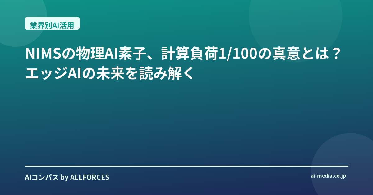 NIMSがまたすごいことやってくれたね!「計算負荷を100分の1に低減する物理AI素子を開発」ってニュース、正直、あなたも「また新しいAIチップの話か」って思ったんじゃないかな?僕も最初はそうだったんだ。この業界に20年近くいると、新しい技術の発表なんて日常茶飯事だからね。でもね、この「100分の1」っていう数字は、ちょっと尋常じゃない。これは単なる効率化の話じゃない、AIの未来を根本から変える可能性を秘めているんだ。