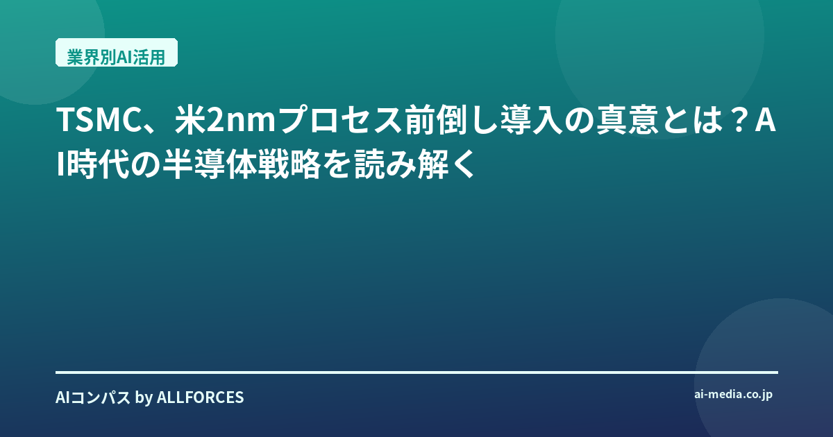 TSMC、米2nmプロセス前倒し導入の真意とは?AI時代の半導体戦略を読み解く TSMCがアリゾナでの2nmプロセス導入を前倒しするというニュース、正直、驚きましたよね?「またか」と思った人もいるかもしれませんが、AI業界を20年見てきた私からすると、これは単なる設備投資の話じゃないんです。もっと深い、AI時代の半導体戦略の転換点を示唆しているように感じています。あなたもそう思いませんか? 半導体、特に最先端の微細化プロセスは、今のAIの進化を支える心臓部です。GPUやNPUといったAIチップの性能は、この微細化の進展に文字通り直結しています。私がまだ若かった頃、AIが「エキスパートシステム」なんて呼ばれていて、ソフトウェアのロジックが主役だった時代とは隔世の感がありますね。当時は、ハードウェアがここまでボトルネックになるとは想像もしていませんでした。でも今は、AIモデルの巨大化と複雑化が進むにつれて、いかに効率的で高性能なチップを供給できるかが、技術革新の鍵を握っている。TSMCの今回の動きは、このAI時代の「半導体戦争」における彼らの、そして世界の戦略を如実に示していると言えるでしょう。 今回の前倒しの最大の要因は、やはり「AI関連の強い需要」に他なりません。Web検索結果を見ても明らかですが、NVIDIAの高性能GPU、GoogleのTPU、そしてAppleのAシリーズチップなど、主要なAIチップベンダーはTSMCの最重要顧客です。彼らが開発する次世代AIチップは、より高い性能と電力効率を求めており、それが2nmプロセス、つまりN2技術への早期移行を強く後押ししているわけです。 技術的な側面から見ると、この2nmプロセスは非常に画期的なんです。第1世代のGate-All-Around (GAA) ナノシートトランジスタ技術を特徴としており、従来の3nmプロセスと比較して、性能が15%向上し、消費電力が最大30%削減されると期待されています。これはAIチップにとって、まさに喉から手が出るほど欲しい進化ですよね。さらに、N2 NanoFlex設計の導入や、低抵抗再配線層 (RDL) と超高性能金属-絶縁体-金属 (MiM) コンデンサの開発も、この性能向上に大きく寄与していると聞きます。単にトランジスタを小さくするだけでなく、チップ全体のアーキテクチャレベルでの最適化が進んでいる証拠です。 そして、ビジネスと投資の規模も尋常ではありません。TSMCはアリゾナ州に合計650億ドルを投資し、さらに今後数年間で1000億ドルを追加投資する計画だというから驚きです。3つの先進的なウェハー工場、2つのIC組立工場、そして1つの研究開発センターを建設するとのこと。特に私が注目しているのは、Amkor Technologyとの提携です。アリゾナで3D Chip-on-Wafer-on-Substrate (CoWoS) パッケージングや統合ファンアウト (InFO) 組立サービスを開発するという話は、単にチップを製造するだけでなく、AIチップに不可欠な高度なパッケージング技術まで現地で提供しようという、TSMCの強い意志の表れだと見ています。これは、サプライチェーン全体を米国で完結させようとする動きの一環でしょう。 地政学的な側面も無視できません。台湾経済部大臣J.W. Kuo氏がTSMCの米国投資を許可したというニュースは、この動きが単なる経済合理性だけでなく、米中間の技術覇権争いや、サプライチェーンの強靭化という国家戦略レベルの思惑が絡んでいることを示唆しています。正直なところ、企業がこれほど大規模な投資を海外で行う背景には、常に政治的な圧力が存在すると、長年の経験から感じています。 もちろん、すべてが順風満帆というわけではありません。台湾での2nm量産は2025年末、N2PやA16プロセスは2026年と計画されている一方で、アリゾナでの2nm導入は当初2028年頃と見られていたものが前倒しされたとはいえ、台湾の工場より「1世代遅れる」という現実もあります。これは、技術移転の難しさ、熟練工の確保、そして文化的な違いといった、様々な課題が横たわっていることを示唆しているのではないでしょうか。 では、このTSMCの動きは、私たち投資家や技術者にとって何を意味するのでしょうか? 投資家の方々へ。TSMCの動きは、AI半導体市場の成長が予想以上に加速していることを明確に示しています。NVIDIA、AMD、Intel、Qualcomm、AppleといったTSMCの主要顧客はもちろんのこと、関連するEDAツールベンダーや半導体製造装置メーカー(ASML、Applied Materialsなど)の動向は引き続き注視すべきでしょう。ただし、過度な期待は禁物です。地政学リスクや建設コストの高騰といった逆風も常に意識しておく必要があります。半導体業界は常に変動が激しいですからね。 そして技術者の皆さんへ。2nmプロセスがもたらす性能向上は、AIモデルのさらなる大規模化、そしてより効率的な運用を可能にします。GAAトランジスタやCoWoSのような先端パッケージング技術の理解は、次世代AIシステム設計において必須となるでしょう。米国での生産拡大は、現地での技術者採用の機会も増やすかもしれません。新しい技術トレンドに常にアンテナを張り、