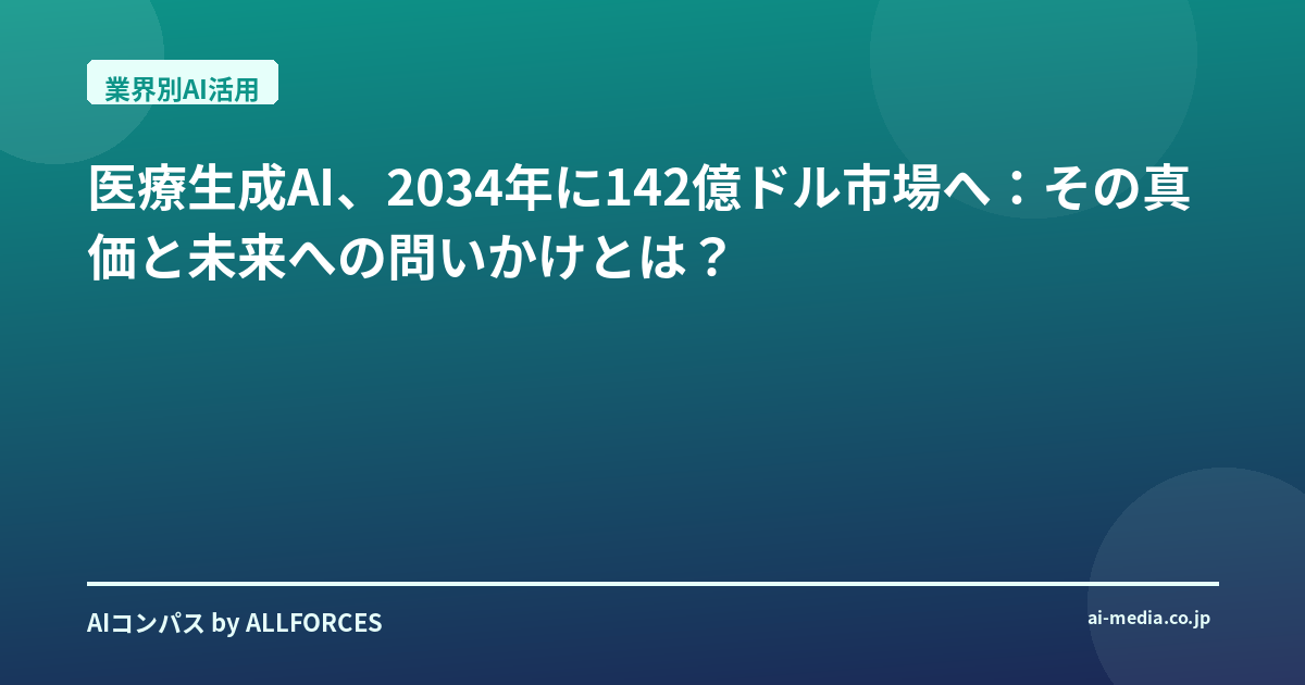 「医療生成AI市場が2034年には142億ドルに達する」――この数字を聞いて、あなたはどう感じましたか?正直なところ、私自身、この手の予測にはいつも一歩引いて見てしまうんです。20年間この業界を見てきて、AIが「次の大きな波」だと言われ続けてきた中で、期待先行で終わったプロジェクトも数多く見てきましたからね。でも、今回の医療分野における生成AIの動きは、これまでとは少し違う、本質的な変化の兆しを感じています。
