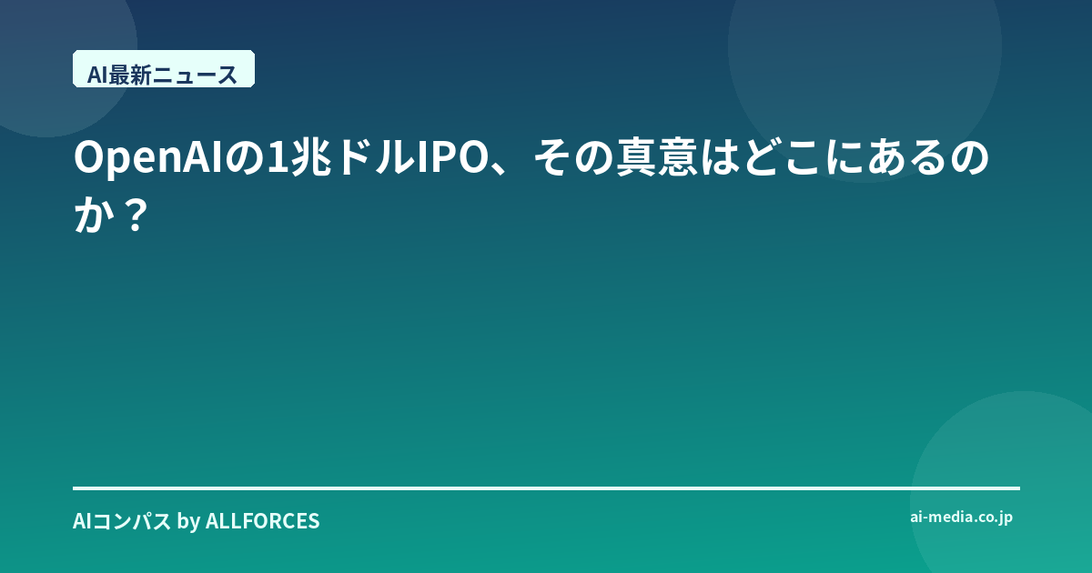 OpenAIの1兆ドルIPO、その真意はどこにあるのか? あなたも感じているかもしれませんが、最近のOpenAIに関するニュースは、まるでSF映画の脚本を読んでいるかのようです。1兆ドル規模の新規株式公開(IPO)の準備を進めているという報道、正直なところ、私の20年間のAI業界ウォッチ歴の中でも、これほどまでに度肝を抜かれる話はそうありませんでした。シリコンバレーのスタートアップから日本の大企業まで、数百社のAI導入を間近で見てきた私ですが、この数字はまさに桁違い。一体、彼らは何を企んでいるのでしょうか? AIが「次の産業革命」だと言われ始めて久しいですが、OpenAIの動きは、その革命が単なる技術革新に留まらないことを示唆しています。彼らは、2019年に非営利団体から「上限付き営利」モデルへと移行し、さらに2025年10月にはOpenAI Group PBCとして組織再編を行うなど、その形態を柔軟に変えながら、一貫して「汎用人工知能(AGI)の安全かつ有益な開発」という壮大なミッションを追求してきました。このミッションを達成するためには、途方もない資金が必要になることは、業界にいる私たちなら容易に想像できますよね。 今回のIPO報道の核心は、その資金調達の規模と目的にあると見ています。報道によれば、OpenAIは2026年後半にも米国証券取引委員会(SEC)に上場申請を行い、2027年の上場を目指しているとのこと。そして、その目標調達額は少なくとも600億ドル。これは、彼らが計画しているAIインフラストラクチャへの巨額投資、特に「Stargateプロジェクト」と呼ばれる5,000億ドル規模のデータセンター構想を支えるためだと考えられます。GPTファミリー、DALL-Eシリーズ、そして最近話題のSoraモデルといった最先端の生成AI技術を開発し続けるには、膨大な計算資源が不可欠です。深層学習、機械学習、強化学習、自然言語処理といった技術の進化は、まさにハードウェアの進化と表裏一体。 実際、OpenAIはすでに、その資金需要の大きさを露呈しています。2025年上半期には135億ドルもの損失を計上しているというデータは、彼らがどれほど積極的に投資を行っているかの証左でしょう。高価なGPU、データセンターの構築、そして世界トップクラスのAI人材の確保には、想像を絶するコストがかかります。だからこそ、彼らはMicrosoftからの130億ドル以上の投資に加え、ソフトバンクグループ、Dragoneer Investment Group、Thrive Capital、Coatue、Altimeter、Nvidiaといった名だたる投資家から総額579億ドルもの資金を調達してきたわけです。 さらに注目すべきは、ハードウェアパートナーシップの積極的な展開です。Oracleとは3,000億ドル相当のコンピューティング能力の購入契約を、Nvidiaとは10ギガワット以上のシステム展開と1,000億ドルの投資を含むパートナーシップを、そしてAMDとは6ギガワット相当のチップ購入契約を締結していると聞けば、彼らが単なるソフトウェア企業ではないことが分かります。MicrosoftのAzureクラウドサービスへの2,500億ドルのコミットメントも、その戦略の一環でしょう。これは、AIの未来が、ソフトウェアとハードウェアの融合によってのみ実現されるという、彼らの強い信念の表れだと私は見ています。 では、私たち投資家や技術者は、この動きから何を読み取るべきでしょうか? まず、AIインフラへの投資は今後も加速するということです。GPUメーカーであるNvidiaの株価がAIブームの恩恵を大きく受けているのは周知の事実ですが、データセンター関連企業や、AIチップ開発に携わる企業にも、引き続き注目が集まるでしょう。また、OpenAIが目指すAGIは、ChatGPTのようなコンテンツ作成、チャットボット、言語翻訳、さらにはAIを活用したトレーディングボットといった幅広いアプリケーションの可能性をさらに広げます。既存のビジネスモデルをAIでどう変革できるか、あるいは新たなAIネイティブなサービスをどう生み出すか、技術者にとっては腕の見せ所です。 もちろん、サム・アルトマンCEOがIPOを「最も可能性の高い道筋」と認めている一方で、OpenAIの広報担当者は「現在の焦点ではない」と述べている点も忘れてはなりません。これは、彼らが戦略的な選択肢を複数持ち、市場の動向を見極めている証拠かもしれません。しかし、これだけの資金需要と、AGIという壮大な目標を考えれば、IPOは避けて通れない道のように私には思えます。 この1兆ドルIPOの噂は、AI業界が新たなフェーズに入ったことを告げる狼煙なのかもしれません。私たちは、この歴史的な転換点にどう向き合い、どのような未来を築いていくべきなのでしょうか? あなたなら、このOpenAIの動きをどう解釈しますか? この歴史的な転換点にどう向き合い、どのような未来を築いていくべきなのでしょうか? あなたなら、このOpenAIの動きをどう解釈しますか? 私個人的には、これは単なる資金調達の枠を超えた、彼らの壮大なビジョンと、それを実現するための覚悟の表れだと感じています。そして、その覚悟は、私たち一人ひとりの未来に
