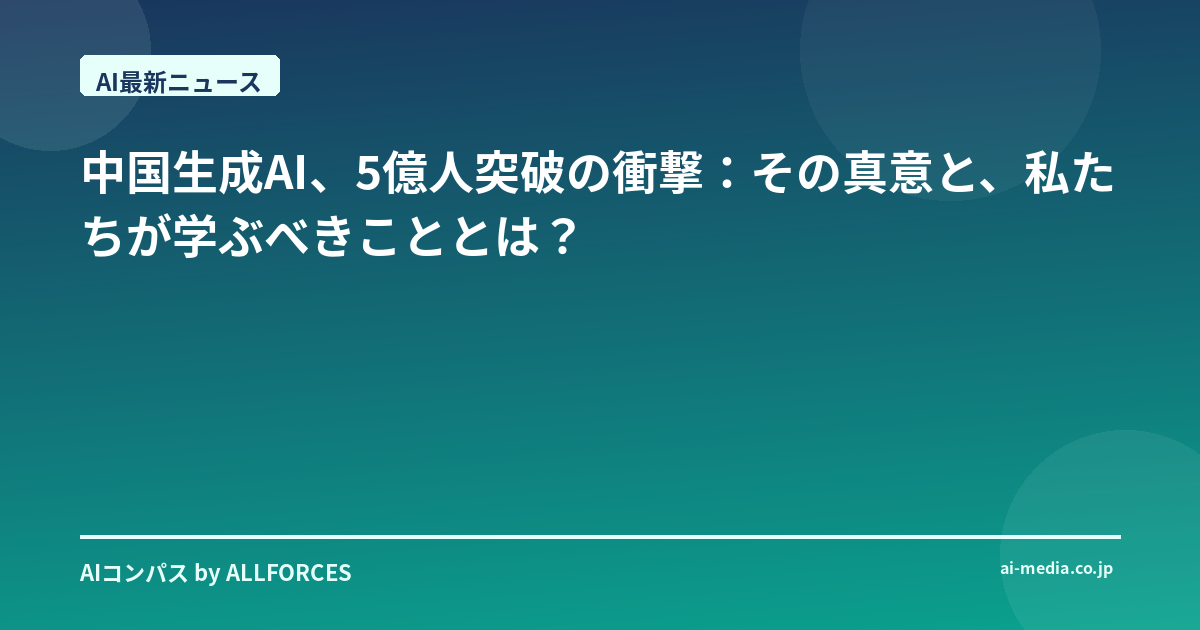 中国生成AI、5億人突破の衝撃:その真意と、私たちが学ぶべきこととは? いやはや、驚きましたね。中国の生成AIユーザーが、2025年上半期には5億1500万人を突破したというニュース。正直なところ、ここまで急速に普及が進むとは、私自身も少し懐疑的だったんですよ。だって、たった半年でユーザー数が倍増するなんて、尋常じゃないでしょう?あなたも同じように感じているかもしれませんが、これは単なる数字の羅列以上の意味を持つはずです。 私がこの業界に足を踏み入れて20年、シリコンバレーのガレージから生まれたスタートアップが世界を変える瞬間も、日本の大企業がAI導入に苦戦する姿も、数えきれないほど見てきました。その経験から言えるのは、技術の真価は、それがどれだけ多くの人々に使われ、生活に溶け込んでいるかで測られるということ。中国のこの数字は、まさにその「浸透度」を如実に示しているわけです。国内のインターネットユーザーの36.5%が生成AIを使っているという事実は、もはや「一部のギークが使うツール」というレベルではないことを物語っています。特に、若年層と高学歴者が中心というデータは、今後の社会や経済に与える影響の大きさを予感させますね。 では、この驚異的な普及の背景には何があるのでしょうか?まず、中国政府の「AIプラス」戦略は無視できません。これは、AIを社会と経済のあらゆる分野に統合しようという国家的な取り組みで、企業への財政支援も手厚い。そして、アリババ、テンセント、美団、アントグループといった巨大テック企業が、AIスタートアップへの投資を加速させている。サウジアラビアのAramcoがZhipu AIを支援しているように、海外からの投資も活発です。こうした強力な後押しが、技術開発と普及のエンジンになっているのは間違いありません。 技術面でも、中国は目覚ましい進歩を遂げています。2025年4月までに150万件以上のAI関連特許を出願し、これは世界の約39%を占めるというから驚きです。そして、ユーザーの90%以上がDeepSeek、Alibaba CloudのQwen、ByteDanceのDoubaoといった国内のAIモデルを好んで使っているというのも興味深い点です。以前は「米国モデルの後追い」という見方もあったけれど、今や中国の大規模言語モデルは、米国のモデルとの性能差を急速に縮め、一部のバイリンガルベンチマークでは米国モデルを上回る性能を示すものも出てきている。特にDeepSeekのように、開発コストを抑えつつ高性能を実現するスタートアップの存在は、今後の競争環境をさらに激化させるでしょう。 投資家や技術者であるあなたにとって、この状況は何を意味するのでしょうか?まず、中国市場の巨大なポテンシャルを再認識すべきです。2025年には60億ドル未満だった生成AI市場が、2031年には380億ドル以上に成長すると予測されている。これは、新たなビジネスチャンスの宝庫と言えるでしょう。しかし同時に、国内モデルの優位性という壁も存在します。海外企業が中国市場に参入するには、現地の文化やニーズに合わせたローカライズはもちろん、強力なパートナーシップが不可欠になるでしょう。技術者としては、中国のAIモデルの進化を注視し、そのアーキテクチャや学習方法から学ぶべき点は多いはずです。特に、限られたリソースで高性能を実現するDeepSeekのようなアプローチは、私たちにとっても示唆に富んでいます。 正直なところ、このスピード感には少し戸惑いも感じます。かつては「AIはまだ未来の技術」なんて言っていた時代が嘘のようですね。しかし、この現実を直視し、そこから何を学び、どう行動するかが、これからの私たちの未来を左右するのではないでしょうか。中国の生成AIの爆発的な普及は、私たちに何を問いかけているのでしょう? この問いかけに、私はいくつかの側面から答えたいと思います。それは、単なる技術的な優位性や市場規模の話に留まらず、社会構造、倫理観、そして私たち自身の未来の働き方にまで深く関わってくるからです。 ### 1. 中国の普及がもたらす真の衝撃:単なる数字の裏側 5億人という数字は、単に多くの人が生成AIを使っているというだけでなく、中国社会全体がAIを前提とした生活様式へと急速にシフトしていることを意味します。交通、医療、教育、エンターテイメント…あらゆる分野でAIが介在し、最適化される未来が、すでに中国では現実のものとなりつつあるのです。これは、私たちの想像をはるかに超える速度で、社会構造そのものを変え得る力を持っています。 特に注目すべきは、この膨大なユーザーからのフィードバックが、AIモデルの精度を飛躍的に向上させている点です。この「データ優位性」は、中国のAI企業にとって計り知れない資産となるでしょう。ユーザーが多ければ多いほど、AIは賢くなり、賢くなればなるほど、さらに多くのユーザーを引きつける。この好循環が、中国のAIエコシステムを磐石なものにしているのです。 そして、若年層と高学歴者が中心