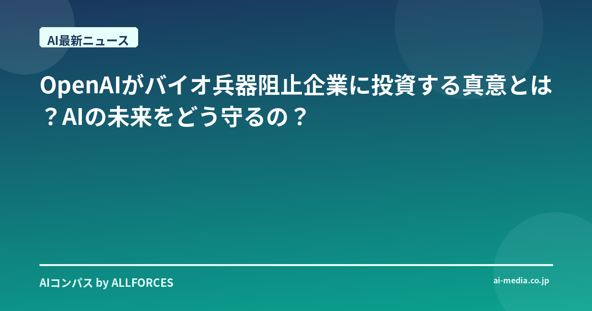OpenAIがバイオ兵器阻止企業に投資する真意とは?AIの未来をどう守るのか いやはや、最近のAI業界は本当に目まぐるしいですね。あなたも感じているかもしれませんが、OpenAIがAIバイオ兵器の脅威に対抗する企業に投資したというニュース、正直なところ、個人的には「ついに来たか」という印象でした。AIの進化が加速する中で、その負の側面、特に悪用される可能性については、私たちテクノロジー・アナリストの間でも常に議論の的でしたからね。 私がこの業界に足を踏み入れて20年、シリコンバレーのガレージから生まれたスタートアップが世界を変える瞬間も、日本の大企業がAI導入に苦戦する姿も、数えきれないほど見てきました。技術は常に両刃の剣です。インターネットが情報革命をもたらした一方で、サイバー犯罪という新たな脅威を生んだように、AIもまた、人類に計り知れない恩恵をもたらすと同時に、想像を絶するリスクをはらんでいます。特に、バイオテクノロジーとAIが融合した際の潜在的な危険性は、SFの世界の話ではなく、現実のものとして捉えるべき喫緊の課題だと私は考えています。 今回のOpenAIの動きは、まさにその危機感の表れでしょう。彼らが投資したのは主に2つの企業、Red Queen BioとValthosです。Red Queen Bioは、Helix Nanoのスピンオフとして注目されていますね。彼らはAIと最先端のラボ研究を組み合わせることで、新たなバイオリスクを特定し、それに対する防御策を開発しようとしています。AIが進化すればするほど、未知の脅威が生まれる可能性も高まるわけで、それをAI自身の力で先回りして防ごうというアプローチは、非常に理にかなっていると言えるでしょう。 一方、Valthosは、OpenAIだけでなく、Founders FundやLux Capitalといった名だたるVCからも出資を受けています。彼らの専門は、AIによって設計されうるバイオ兵器攻撃を早期に検知し、防御するシステムを構築すること。これは、まさに「盾」の役割を果たす技術です。AIが生成する膨大なデータの中から、悪意のあるパターンや異常を瞬時に見つけ出す能力は、人間の目では到底追いつかない領域ですから、AIによる監視と防御は不可欠になってくるでしょう。 OpenAIの最高戦略責任者であるジェイソン・クォン氏が、この分野のスタートアップへの追加投資に意欲を示していることからも、彼らがこの問題にどれほど真剣に取り組んでいるかが伺えます。彼は、技術がリスク軽減とエコシステム全体のレジリエンス向上に不可欠だと強調していますね。これは単なる慈善事業ではなく、AIの健全な発展と社会受容性を確保するための、極めて戦略的な投資だと見るべきです。 もちろん、私自身、最初は少し懐疑的な部分もありました。AIがAIの悪用を防ぐという構図は、まるで自己言及のパラドックスのようにも聞こえますからね。しかし、これまでの経験から言えるのは、どんなに優れた技術も、それをどう使うか、どう管理するかにかかっているということです。AIの能力が指数関数的に向上する中で、その制御と倫理的な利用は、技術開発と同じくらい、いやそれ以上に重要なテーマになってきています。 この動きは、投資家にとっても、技術者にとっても、重要な示唆を与えています。投資家であれば、単にAIの成長性だけでなく、そのリスク管理や倫理的側面に取り組む企業にも目を向けるべきでしょう。バイオセキュリティは、今後間違いなく成長するニッチな市場になるはずです。技術者であれば、自分の開発するAIが社会にどのような影響を与えるのか、常に多角的に考える視点を持つことが求められます。AI倫理や安全性に関する国際的な議論、例えばEUのAI Actのような動きも加速していますから、そうした動向にも常にアンテナを張っておくべきです。 AIの未来は、私たち一人ひとりの選択と行動にかかっています。OpenAIの今回の投資は、AIがもたらす光と影の両方を見据え、影の部分にも積極的に対処しようとする、ある種の覚悟の表れだと私は感じています。あなたは、この動きをどう捉えますか?AIの安全な未来のために、私たちにできることは何だと思いますか? あなたは、この動きをどう捉えますか?AIの安全な未来のために、私たちにできることは何だと思いますか? 正直なところ、一言で答えを出すのは難しいテーマです。しかし、私たちがこの分野で長年培ってきた経験と知識から言えることがいくつかあります。OpenAIの今回の投資は、単なる技術的な防御に留まらない、より広範な意味を持つと私は考えています。AI開発の最前線に立つ彼らが、自らの生み出す技術のリスクに真摯に向き合う姿勢は、業界全体に大きなメッセージを送っています。これは、AIの未来を「誰かに任せる」のではなく、「自ら積極的に形作る」という強い意志の表れではないでしょうか。 ### AIの「両刃の剣」をどう制御するか:技術者への提言 まず、技術者の皆さん、あなた方に伝えたいのは、AI開発はもはや「動けばよし」の時代では