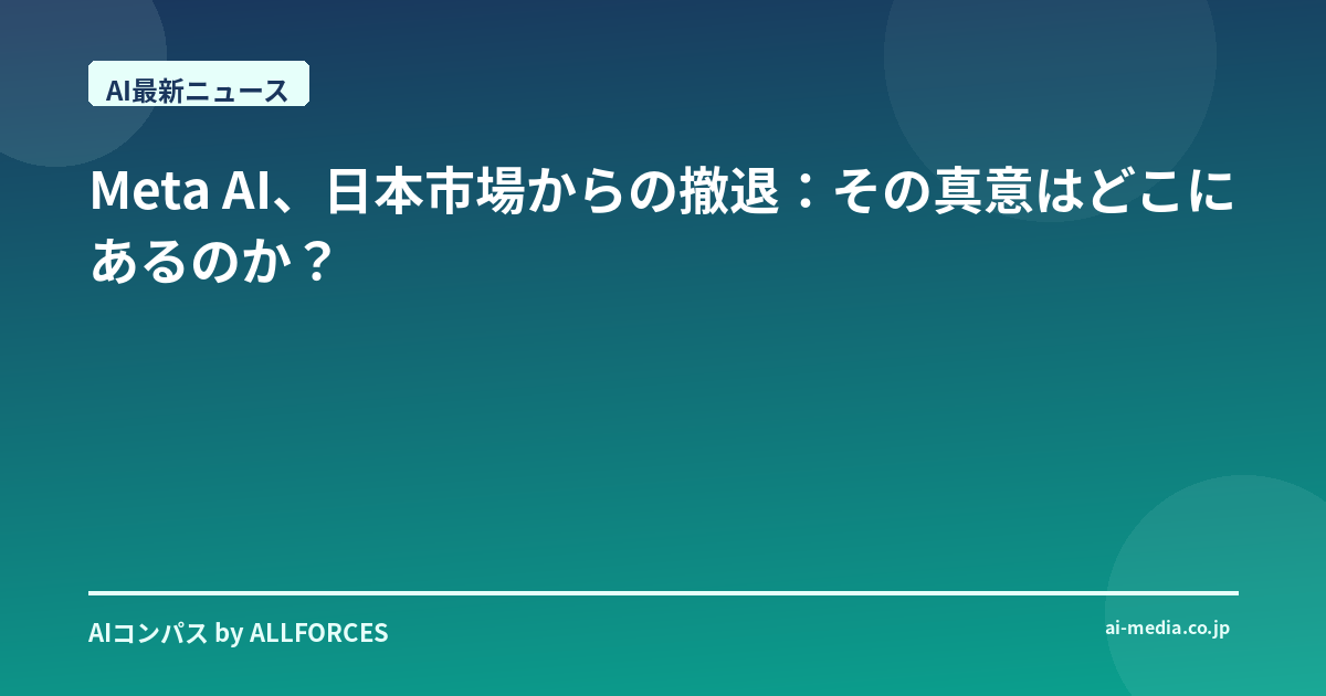 Meta AI、日本市場からの撤退:その真意はどこにあるのか? 皆さん、おはようございます。AI業界を20年見てきた私にとっても、今朝のニュースは正直驚きを隠せませんね。Meta AIが本日11月25日をもって日本市場からの撤退を発表したと聞きました。いやはや、まさかこんな展開になるとは。あなたも同じように感じているかもしれませんが、一体何がMetaをこの決断に駆り立てたのでしょうか? 思い返せば、Metaは近年、AI分野への投資を惜しまない企業の1つでした。ザッカーバーグCEOが「AIが最優先事項」と公言し、2025年にはAI関連プロジェクトに600億ドルから650億ドルという巨額を投じる計画を発表していましたね。これはもう、本気度が違う。彼らはChatGPTのような汎用生産性ツールとの直接競争から一線を画し、「パーソナルスーパーインテリジェンス」という、よりエンターテイメントやソーシャルコネクション、ライフスタイルに密着したAIの未来を描いていました。その中核を担うのが、オープンソース戦略で業界標準化を目指す大規模言語モデル「Llama」シリーズ。特に「Llama 3」の2つの小規模バージョンをMeta AIアシスタントに組み込み、さらには「Llama 4」の開発にはLlama 3の約10倍もの計算能力が必要になるとまで言及していましたから、その技術的な野心は計り知れません。データラベリングのスタートアップであるScale AIへの143億ドルの投資も、Llamaモデルの性能向上や広告・リール動画のレコメンデーションAIの精度向上を狙ったものでした。 これだけの投資と戦略がありながら、なぜ日本市場での撤退を選んだのか。発表によると、理由は「エンゲージメントレベルの低さ」と「技術的な課題」とのこと。うーん、個人的には、ここにこそ深い洞察が必要だと感じています。Meta AIアシスタントは、Instagram、Facebook、Messenger、WhatsAppといったMeta製品群にシームレスに統合され、コンテンツ作成、アイデア生成、さらにはエンターテイメントと幅広い機能を提供していました。グローバルでは一定の評価を得ていたはずです。しかし、日本市場ではなぜユーザーの心をつかめなかったのか。 考えられるのは、まず日本のユーザーが持つ独特のAIに対する期待値や利用習慣です。欧米諸国と比較して、AIチャットボットを日常のコミュニケーションやクリエイティブな活動に積極的に活用する文化がまだ根付いていなかったのかもしれません。あるいは、既存のLINEなどのコミュニケーションツールが持つ強固なエコシステムが、Meta AIの浸透を阻んだ可能性もあります。 そして「技術的な課題」。これは興味深いですね。MetaのAI技術は、コンピュータービジョン、機械学習、生成AI技術、自然言語処理と多岐にわたり、Llama 3のような大規模モデルで人間のような文章、画像、コード、音声を生成できるはずです。Meta AIチャットボットは文脈理解、多言語コミュニケーション、画像生成、リアルタイム情報処理といった高度な機能を謳っていました。しかし、日本語という言語の複雑さ、文化的なニュアンスの理解、あるいは日本固有のデータセットの不足が、彼らが想定していた以上のハードルになった可能性も否定できません。Ray-Ban MetaスマートグラスやAI生成ビデオを作成するVibesのような革新的な製品も展開していますが、これらの技術が日本のユーザー体験に十分に適応できなかったのかもしれません。 今回の撤退は、日本のAI戦略にも少なからず影響を与えるでしょう。日本政府は、国内技術の優先、国家安全保障の強化、そして外国システムへの依存度低減を明確な目標として掲げています。AI専門家の誘致や、大学、研究機関、企業間の連携強化を推進する計画もあります。Metaのような巨大プレイヤーが撤退することで、一見すると日本のAI市場に「空き」が生じたように見えるかもしれません。しかし、これは日本の企業や研究機関が、より自国のニーズに合ったAIソリューションを開発・提供するチャンスと捉えることもできます。あるいは、他国のAI企業が日本市場の特殊性を再認識し、よりローカライズされたアプローチを模索するきっかけになる可能性もありますね。 正直なところ、一過性の撤退なのか、それともグローバルなAIモデルが特定の市場で直面する根本的な課題を示唆しているのか、まだ判断は難しい。しかし、今回のMeta AIの決断は、AI技術の汎用性がいかに高いとはいえ、その展開には文化、言語、そして市場の成熟度といった多様な要因が複雑に絡み合うことを改めて教えてくれた気がします。他のグローバルAIプレイヤーは、この日本での事例から何を学ぶべきだと、あなたは考えますか? この問いは、今後のAI市場の動向を占う上で非常に重要だと、私は考えています。Meta AIの日本撤退は、単なる一企業の事業判断にとどまらず、グローバルなAI展開における普遍的な課題を浮き彫りにした、貴重なケーススタディと言えるでしょう。 ### グローバルAIプレイヤーが日本市場から学ぶべき教訓 ま