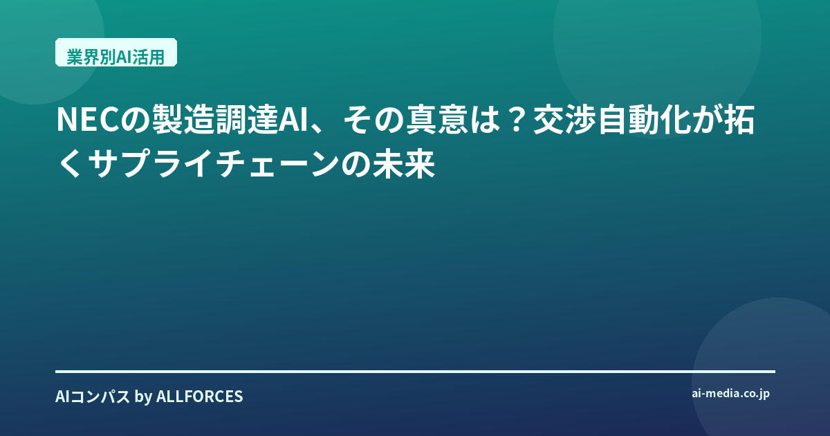 正直なところ、NECが製造調達に「自動交渉AI」を導入するというニュースを聞いた時、私は一瞬、「また来たか」と感じましたね。あなたも感じているかもしれませんが、この手の「AIで業務効率化」という話は、過去20年間、何度となく聞いてきましたから。でも、今回のNECの発表は、ちょっと違う、いや、かなり違うんじゃないかと、読み進めるうちに考えを改めました。単なる効率化を超え、製造業のサプライチェーン、ひいては私たちの働き方そのものに、静かだけど確実な地殻変動をもたらす可能性を秘めている、と。