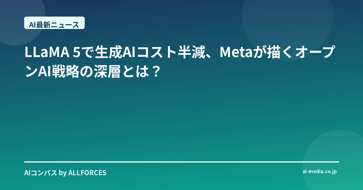 MetaがLLaMA 5で生成AIのコストを半減させると言った時、正直、最初に何を思いましたか?「またか」と、少し斜に構えた人もいるかもしれませんね。シリコンバレーで20年間、この業界の浮き沈みを見てきた私からすると、こうした“衝撃的な”発表は枚挙にいとまがありません。しかしね、今回のMetaの発表、よくよく考えてみると、ただの数字以上の、いや、私たちの業界の未来を形作るかもしれない大きな意味を秘めているように感じたんですよ。