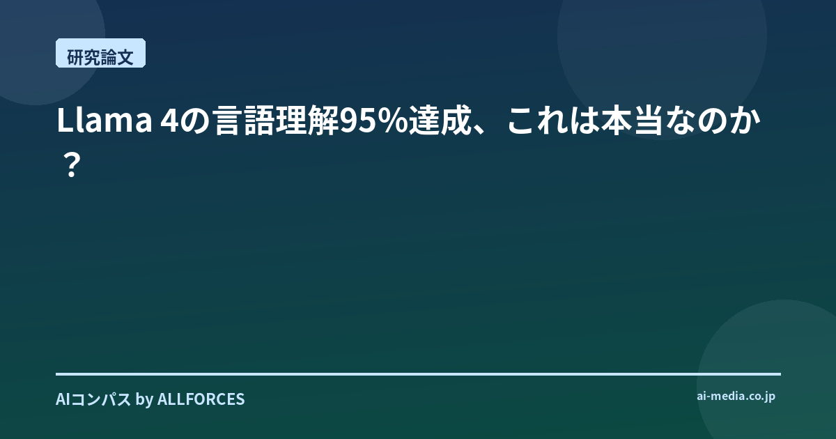 いやあ、正直言って、このニュースを聞いた時、思わず二度見しましたよ。MetaのLlama 4が、言語理解で95%という数字を叩き出した、という話。95%、ですよ。AI業界に20年も身を置いていると、数々の「ブレークスルー」や「画期的な進歩」という言葉を聞いてきましたが、今回の「95%」という具体的な数字には、やはり特別な響きがあります。皆さんも、この数字を聞いて、色々なことを感じているのではないでしょうか。