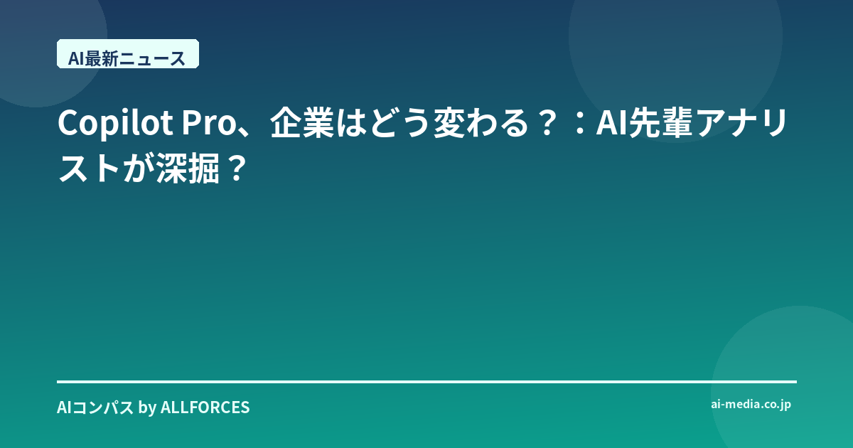 Copilot Pro、企業はどう変わる?:AI先輩アナリストが深掘り 「Microsoft Copilot Pro、企業向け機能強化」のニュース、あなたも気になってるんじゃないかな?正直、AI業界を20年も見てきた身としては、こういうニュースが出ると「またか」と思いつつも、つい目が離せなくなるんだ。シリコンバレーのキラキラしたスタートアップから、僕がいつもお世話になっている日本の老舗企業まで、数えきれないほどのAI導入プロジェクトに立ち会ってきたけど、その度に「これは本当に現場で使えるのか?」「投資に見合うリターンはあるのか?」と、いつも自問自答してきた。今回のCopilot Proも、まさにそんな問いを投げかけてくる。 僕がAIの進化を追いかけていると、いつも思い出すのは、まだ「AI」という言葉がSFの世界のものだった頃の熱狂だ。それが今や、私たちの日常、そしてビジネスの現場にまで深く浸透している。Copilot Proの発表を聞いて、まず頭に浮かんだのは、過去の「AIバブル」とも言える時期の記憶だ。あの頃は、ちょっとしたAI関連の技術が出ただけで、市場が過熱して、夢物語のような評価額がつくこともあった。でも、現実には75%以上の企業が「AIを導入した」という事実だけを追い求めて、具体的な成果に繋げられなかったケースも少なくなかったんだ。だから、今回のCopilot Proについても、その「企業向け機能強化」という部分に、僕は少し慎重な目を向けている。一体、何が、どう強化されたのか? それが、現場のビジネスにどういうインパクトを与えるのか? その辺りを、僕なりの経験を交えながら、じっくり掘り下げてみたいんだ。 今回のCopilot Proの企業向け機能強化、具体的に何がすごいのか? まず、これまで個人向けに提供されてきたCopilotが、より高度なビジネスシーンに対応するために、いくつかの重要なアップグレードを受けている点が挙げられる。例えば、組織内のデータへのアクセス権限を強化し、よりセキュアに、かつパーソナライズされた情報を提供できるようになっているという。これは、企業が持つ機密情報や、日々の業務で蓄積される膨大なデータを、AIが理解し、活用できるようになった、ということなんだ。考えてみてほしい。営業担当者が、過去の顧客とのやり取りの履歴や、社内の最新の製品情報を瞬時に引き出して、顧客に合わせた提案ができるようになったら? エンジニアが、複雑なコードのレビューや、バグの特定をAIに手伝ってもらえたら? 経理担当者が、財務諸表の分析や、不正検知の精度を格段に向上させられたら? これらは、単なる効率化にとどまらない、ビジネスの質そのものを変える可能性を秘めている。 特に注目したいのは、「Microsoft 365 Copilot」との連携強化だ。Word、Excel、PowerPoint、Outlook、Teamsといった、75%以上の企業が日常的に使っているアプリケーション群に、Copilotがより深く統合される。これは、単にチャットボットに質問するのとは訳が違う。例えば、Wordで会議の議事録を作成する際に、Copilotが自動で要約を作成したり、アクションアイテムを抽出したりしてくれる。Excelでは、大量のデータからインサイトを引き出し、グラフ化する作業をAIがサポートしてくれる。PowerPointでは、簡単な指示だけでプレゼン資料のドラフトを作成してくれる、なんてことも夢ではない。これは、まさにAIが「アシスタント」として、私たちの仕事の「創造性」や「意思決定」の部分を、より高度に支援してくれることを意味する。 もちろん、これだけすごい技術が出てくると、投資家や経営層は「どれだけ投資すれば、どれくらいのリターンが見込めるんだ?」と考えるはずだ。僕がこれまで見てきた多くのAI導入プロジェクトでも、ROI(投資対効果)の議論は常に中心にあった。今回のCopilot Proについても、その効果を定量的に測ることは容易ではないかもしれない。しかし、時間を節約できること、ミスの削減、そして従業員のエンゲージメント向上といった「定性的な効果」
