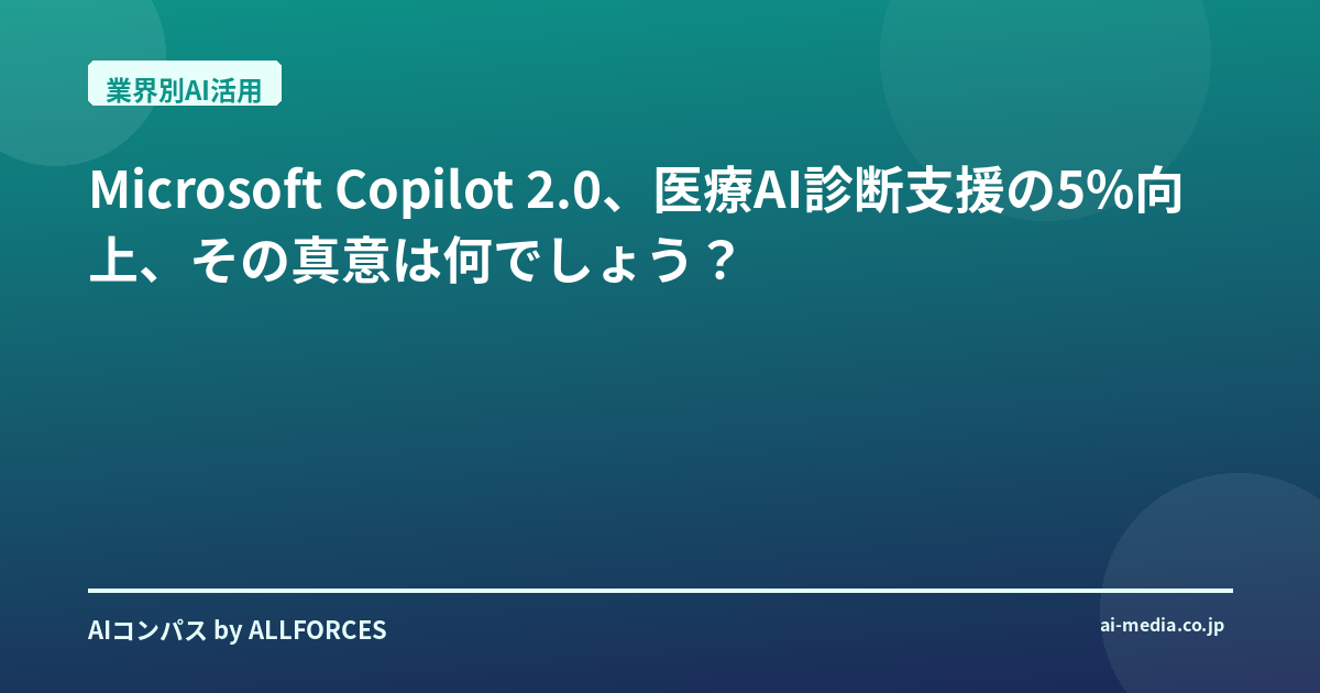 やあ、みんな。AI業界を20年近く見続けてきたベテランアナリストとして、今回の「Microsoft Copilot 2.0、医療AI診断支援で5%向上」というニュースには、正直、少しばかり肩透かしを食らったような気分なんだ。5%向上、ねぇ。もちろん、数字として見れば向上しているのは間違いない。でも、これがどれほど「すごい」ことなのか、あるいは「これから何が起きるのか」を考えるとき、私の20年の経験が、いくつかの疑問符を投げかけてくるんだ。