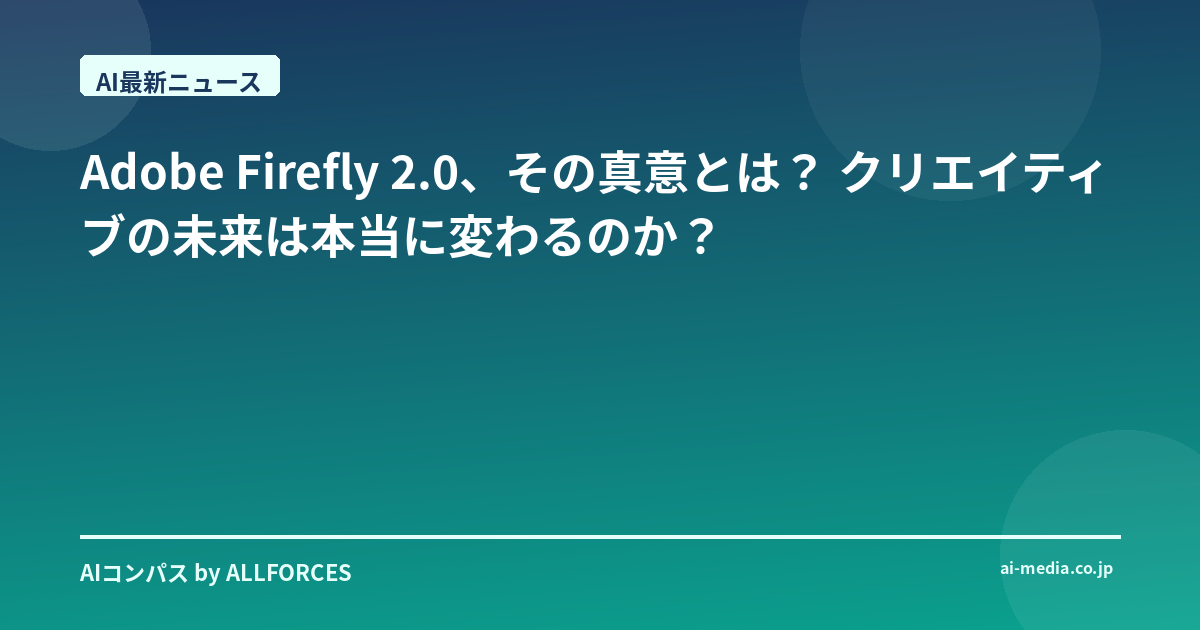 AdobeがFirefly 2.0を発表したね。正直、私のような古い人間からすると、また新しいバージョンか、と一瞬構えてしまうものだよ。だって、この20年、AI業界の浮き沈みをずっと見てきたからね。鳴り物入りで登場しては消えていった技術も数知れず。でも、ちょっと待てよ、今回の発表はただのアップデートじゃないぞ、と私の長年の勘が囁いたんだ。君はどう感じた? 私たちは今、本当に大きな転換点に立っているのかもしれない。