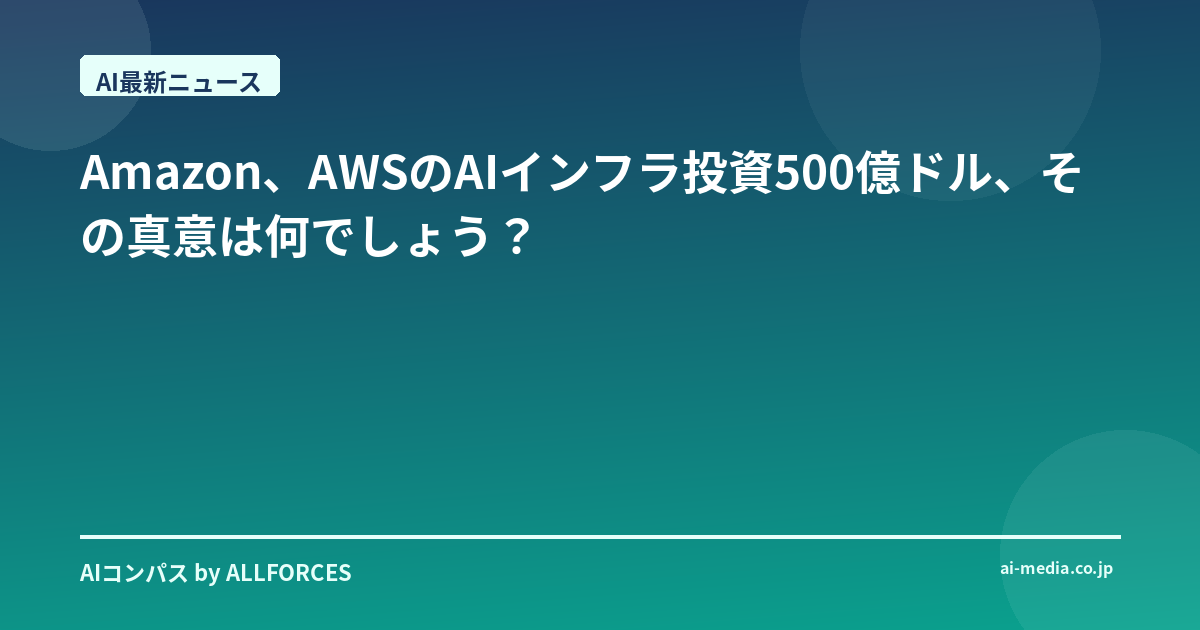 いやー、このニュース、目に飛び込んできたときは、思わず「ほう」と声が出ちゃいましたよ。AmazonがAWSを通じてAIインフラに500億ドル、これはなかなかインパクトのある数字ですよね。AI業界を20年近く見続けてきた身としては、この手の大型投資の話は、もう何度も目にしてきました。サンフランシスコの片隅で生まれた小さなスタートアップが、あっという間にユニコーンになり、あるいは日本の大企業が「AIでDX!」と旗を掲げて、ああでもないこうでもないと試行錯誤する姿を、文字通り数百社、いや、それ以上見てきたかもしれません。