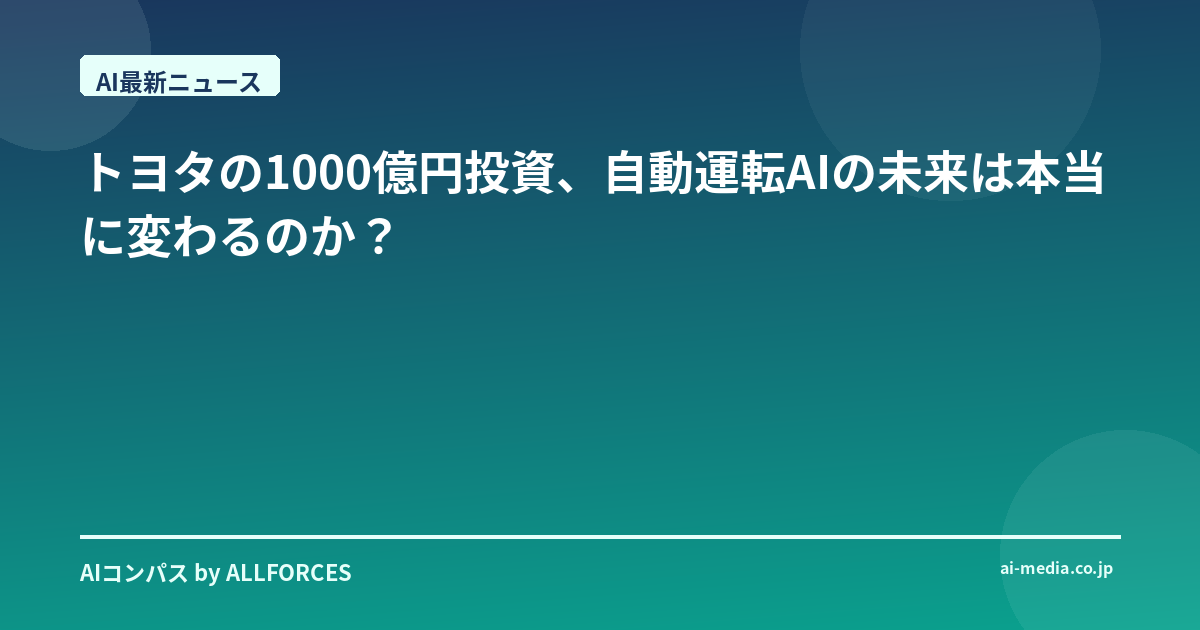 いやー、このニュース、あなたも見た? トヨタが自動運転AIに1000億円も投資するって話。正直、最初その数字を聞いた時、ちょっと「え、マジか…」って声が出ちゃったよ。だって、1000億円だよ? それだけの規模で、しかもAI、それも自動運転となると、これはもう単なるニュースじゃないなって思ったんだ。