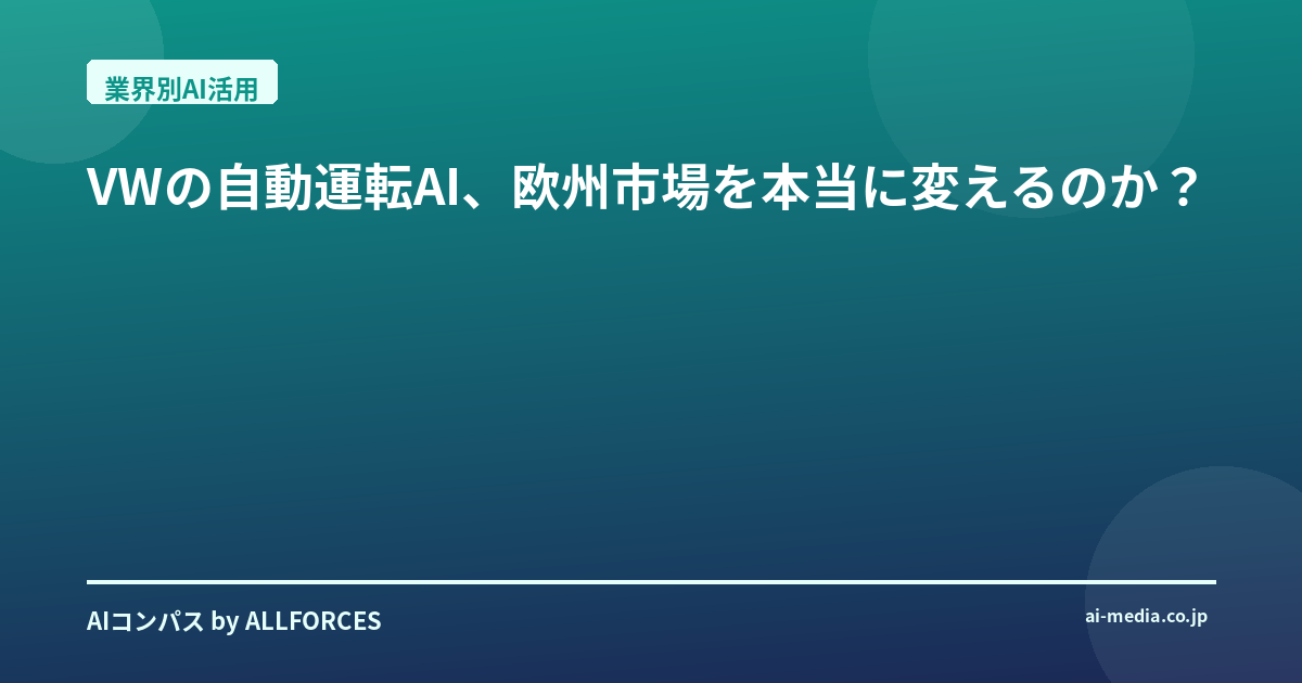 いやー、このニュース、ちらっと目にした時、正直「またか」とも思ったんですよ。フォルクスワーゲン(VW)が自動運転AIで欧州市場を制覇、なんて見出し、ここ数年で何度目でしょうか。AI業界を20年近く見てきていると、こういう壮大な目標を掲げる企業は掃いて捨てるほど見てきました。シリコンバレーのイケイケスタートアップが「我々が世界を変える!」と息巻いたり、日本の老舗企業が「AIでDXを断行!」と宣言したり。その度に、裏側でどんな技術が動いているのか、本当に実現可能なのか、懐疑的な目で見てきたわけです。