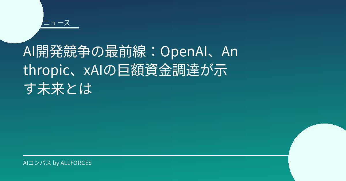 AI業界を20年ウォッチしてきたアナリストとして、皆さんが日々肌で感じているであろう、このAI開発競争の激しさと、そこに投じられる莫大な資金について、今日は少し踏み込んでお話ししたいと思います。特に、OpenAI、Anthropic、そしてイーロン・マスク氏率いるxAIといったプレイヤーたちが繰り広げる、まさに「宇宙規模」の資金調達合戦と、その背後にある開発競争の最前線に迫ります。 ### 1. 導入:AI開発、もはや「宇宙開発」の様相 「最近のAIの進化、本当に目覚ましいですよね。まるでSFの世界が現実になったみたいだと、あなたも感じているかもしれません。」 2024年、AI業界はかつてないほどの熱狂と、そして巨額の資金が動く舞台となっています。特に、OpenAI、Anthropic、xAIといった先端企業は、その開発競争を加速させるために、驚異的な規模の資金調達を成功させています。これは単なる技術開発というレベルを超え、国家プロジェクトや宇宙開発にも匹敵するような、壮大なスケールで進行していると言えるでしょう。 「正直なところ、このスピード感についていくのが大変だと感じることもあるかもしれません。でも、だからこそ、この最前線の動きを理解しておくことは、今後のビジネスやキャリアを考える上で非常に重要なんです。」 ### 2. 背景説明:なぜ今、これほどの資金がAIに集まるのか? AI市場は、2025年時点で2440億ドル(約36兆円 ※1ドル150円換算)規模に達すると予測されており、2030年には8270億ドル(約124兆円)へと、年平均成長率28%という驚異的なペースで成長すると見込まれています(2025年時点のデータ)。特に生成AI市場は、2025年時点で710億ドル(約10.6兆円)と、AI市場全体の約3割を占めるまでに成長しています。 この成長の原動力となっているのが、LLM(大規模言語モデル)をはじめとする生成AI技術の進化です。OpenAIのGPT-5やGPT-4o、AnthropicのClaude Opus 4.5といった最先端モデルは、テキスト生成はもちろん、画像や音声、動画までを統合的に扱うマルチモーダルAIとしての能力を高めています。さらに、自律的にタスクを実行する「AIエージェント」や、思考プロセスを明示する「推論モデル」といった新しい概念も登場し、AIの応用範囲は日々拡大しています。 「まるで、AIという新しい『インフラ』が、あらゆる産業の基盤として再構築されているような感覚です。このインフラをいち早く、そして強力に整備できる企業が、次の時代の勝者になる、そんな見方もできるのではないでしょうか。」 ### 3. 核心分析:巨額資金調達の裏側にある開発競争 このAI開発競争を牽引しているのが、まさに今回焦点を当てるOpenAI、Anthropic、そしてxAIです。 OpenAI: 現在、時価総額8300億ドル(約124兆円)という驚異的な評価額で、1000億ドル(約15兆円)もの巨額資金調達を交渉中と報じられています。これは、スタートアップ史上最大の資金調達となる可能性を秘めています。年間売上も130億ドル(約1.9兆円)に達し、2026年には200億〜260億ドル(約3兆〜3.9兆円)の売上を見込んでいます。主力製品であるGPT-5、マルチモーダルLLMのGPT-4o、そして動画生成AIのSoraなどは、AI技術の最前線を走り続けています。Microsoft、Apple、SoftBankといった強力なパートナーシップも、その勢いを後押ししています。 「OpenAIの資金調達額を聞いたとき、思わず二度見してしまいました。これはもう、単なるスタートアップの成長という次元の話ではないですね。国家予算に匹敵するような資金が、わずか数社に集中しているという事実は、AI開発がどれだけ戦略的な領域になっているかを示しています。」 Anthropic: OpenAIに次ぐ存在として、Anthropicもまた、2025年11月には評価額3500億ドル(約52.5兆円)で150億ドル(約2.25兆円)もの大型資金調達(Series G)を完了しました。年間売上は2025年中頃時点で50億ドル(約7500億円)に達し、2026年には260億ドル(約3.9兆円)の売上予測です。最上位LLMのClaude Opus 4.5をはじめとする「Claude」シリーズは、その安全性と倫理性を重視した設計で注目を集めており、Amazon(AWS)、Google Cloud、Microsoftといった主要クラウドベンダーとの提携も進んでいます。 「Anthropicが、OpenAIとはまた違ったアプローチで、信頼性と安全性を重視したAI開発を進めている点は非常に興味深いです。特に、企業向けのAIソリューションに力を入れていることから、BtoB領域での浸透が期待されますね。」 xAI (Elon Musk): イーロン・マスク氏が率いるxAIも、AI開発競争に参戦しています。2025年11月には、120億ドル(約1.8兆円)の資金調達(Series C)を完了し、テキサス州メンフィスに10万GPU規模のデータセンターを建設するなど、大規模な投資を行っています。xAIは、「真のAI」の探求を掲げ、Grok-2などのモデル開発を進めており、その動向には世界中から注目が集まっています。 「イーロン・マスク氏がAI分野に本格参入してきたことは、業界全体に大きなインパクトを与えています。彼の野心的なプロジェクトが、AI開発のスピードをさらに加速させることは間違いないでしょう。彼が目