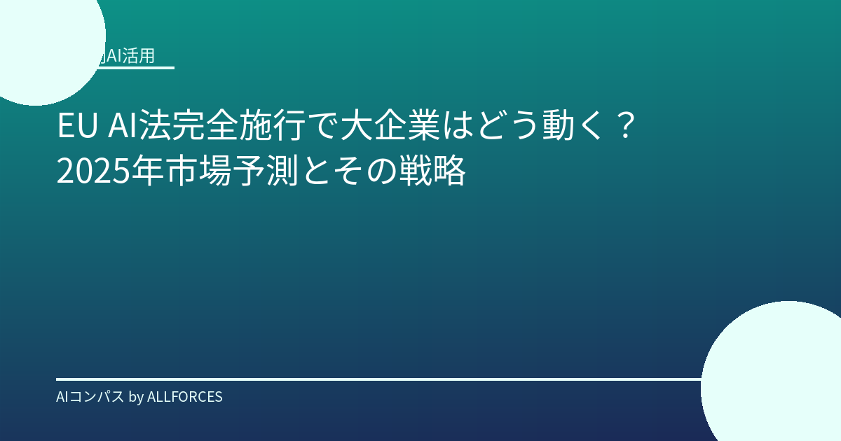 EU AI法完全施行が迫る中、AI導入戦略とリスク管理のポイントを解説します。AI市場は急速に拡大しており、2025年には2440億ドル、2030年には8270億ドルに達すると予測されています(CAGR 28%)。中でも生成AI市場は2025年時点で710億ドルと、前年比55%増と目覚ましい成長を遂げています。日本国内のAI市場も2025年には2兆3000億円規模になると見込まれています。