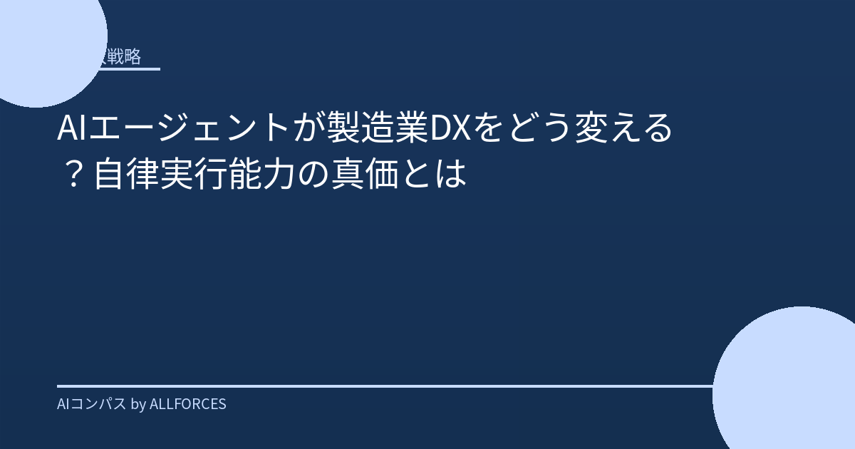 AIエージェントで製造業DXを加速:自律実行能力を活かす導入戦略 製造業の現場で、あなたはこんな課題を感じていませんか?「日々のルーチンワークに追われ、より戦略的な業務に手が回らない」「ベテランのノウハウが形式知化されず、属人的な業務が多い」「人手不足で、生産ラインの安定稼働が難しい」… もし1つでも当てはまるなら、AIエージェントの導入が、その悩みを解決する鍵となるかもしれません。 Gartnerによると、2026年には企業アプリケーションの40%にAIエージェントが搭載されると予測されています。これは、AIエージェントが単なる自動化ツールではなく、自律的にタスクを実行し、ビジネスプロセスを根本から変革する可能性を秘めていることを示唆しています。特に、複雑なオペレーションが求められる製造業において、AIエージェントの導入はDX(デジタルトランスフォーメーション)を加速させる強力な推進力となるでしょう。 ### 1. 戦略的背景:なぜ今、AIエージェントなのか? AI市場は、2025年には2,440億ドル、2030年には8,270億ドル規模に達すると予測されており、その成長率はCAGR 28%という驚異的なものがあります。この巨大な市場の中でも、生成AIは710億ドル規模、AIエージェントは78億ドル規模ながらCAGR 46%という高い成長率を見せています。 なぜAIエージェントがこれほど注目されているのでしょうか?それは、その「自律実行能力」にあります。従来の自動化ツールが、あらかじめ定義されたルールに基づいてのみ動作するのに対し、AIエージェントは、与えられた目標達成のために、自ら状況を判断し、複数のタスクを計画・実行できます。例えば、製造ラインの異常を検知した場合、AIエージェントは自動的に原因を特定し、担当者に通知するだけでなく、必要に応じて代替ラインへの切り替えや、部品の発注までを自律的に行うことが考えられます。 実際に、私が以前関わったプロジェクトでは、品質管理部門のルーチンワークの自動化にAIエージェントを導入しました。画像認識AIが製品の欠陥を検出し、その情報をAIエージェントが受け取り、不良品の種類や発生頻度を分析。さらに、過去の類似事例をデータベースから検索し、改善策の候補をリストアップするという一連のプロセスを、ほぼ人間の介入なしに実行できたのです。これにより、担当者はこれまで膨大な時間を費やしていたデータ分析やレポート作成から解放され、より高度な品質改善活動に集中できるようになりました。 ### 2. フレームワーク提示:AIエージェント導入のための思考法 AIエージェントの導入は、単に技術を導入すれば良いというものではありません。ビジネス戦略と密接に連携させ、段階的に進めることが重要です。そこで、私は以下の4つのフェーズからなるフレームワークを提案します。 フェーズ1:現状分析と課題特定 まずは、自社の業務プロセスを詳細に分析し、AIエージェントが最も効果を発揮できる領域を特定します。特に、定型的かつ反復的なタスク、データに基づいた判断が求められる業務、そして人手不足が深刻な領域に注目しましょう。例えば、生産計画の最適化、在庫管理、品質検査、設備保全の予兆検知などが、AIエージェントの導入に適した候補となります。 フェーズ2:ユースケース定義とPoC(概念実証) 特定した課題に対し、具体的なAIエージェントのユースケースを定義します。そして、小規模なPoCを実施し、技術的な実現可能性とビジネス上の効果を検証します。この段階では、OpenAIのGPT-4o (入力$2.50/1M, 出力$10.00/1M) や、より安価なGPT-4o Mini (入力$0.15/1M, 出力$0.60/1M)、Google Gemini 2.5 Flash (入力$0.15/1M, 出力$0.60/1M) といったAPIを活用し、迅速にプロトタイプを開発することが有効です。特に、Meta (Llama) Llama 3 405BのようなオープンソースLLMは、入力・出力ともに無料(API経由の場合を除く)で利用できるものもあり、コストを抑えながら性能を試すのに適しています。 フェーズ3:スケーリングとシステム統合 PoCで効果が確認されたユースケースは、本格的な導入フェーズへと移行します。既存の基幹システムとの連携を考慮し、AIエージェントがスムーズにデータを取得・処理できるようなシステム設計を行います。この際、AI SaaS・クラウドAIの市場規模が800億ドル以上で、年率35%で成長している ことからも、クラウドベースのソリューションが有力な選択肢となります。 フェーズ4:継続的な改善と最適化 AIエージェントは導入して終わりではありません。運用を開始した後も、そのパフォーマンスを継続的に monitoring し、必要に応じてモデルの再学習やルールの更新を行います。AIエージェントは、自律的に学習し進化していく能力も持っていますが、人間の専門知識によるフィードバックループを設けることで、より精度の高い、ビジネスに貢献するAIへと成長させることができます。 ### 3. 具体的なアクションステップ:今日から始められること では、具体的にどのようなアクションを起こせば良いので