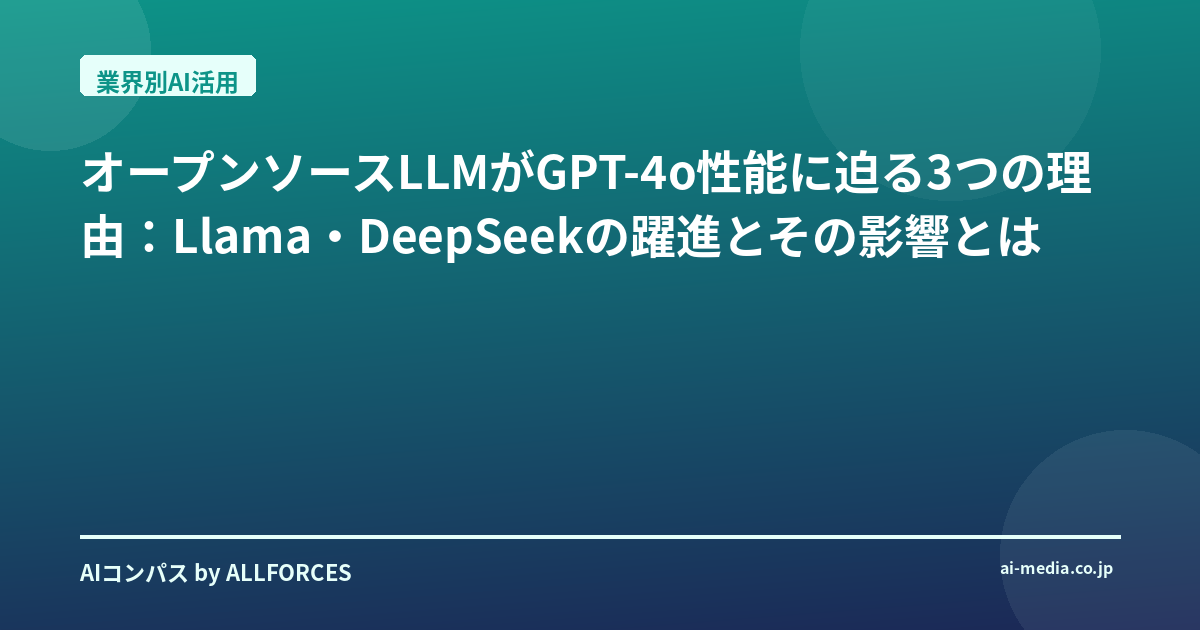 皆さん、こんにちは。AI、DX、エンタープライズテクノロジーの分野で、多岐にわたる業界のAI導入事例を取材・分析してきた経験から、今回はオープンソースLLM(大規模言語モデル)の進化と、それが産業に与える現実的な影響について掘り下げていきたいと思います。特に、LlamaやDeepSeekといったモデルが、某生成AI企業のGPT-4oに匹敵する性能をどのように達成し、各産業でイノベーションを加速させているのか。その最前線を見ていきましょう。