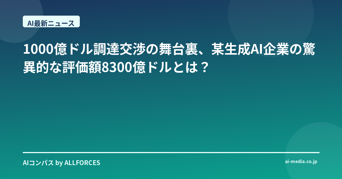 AI業界は今、かつてないほどの熱狂に包まれています。特に某生成AI企業が、評価額8300億ドル(約124兆円)という驚異的なバリュエーションで1000億ドル(約15兆円)規模の資金調達交渉を進めているというニュースは、その象徴と言えるでしょう。この規模の資金調達が実現すれば、スタートアップ史上最大級となります。開発現場で日々AIと向き合っている身からすると、この数字の大きさに改めて驚かされるとともに、AI開発競争の激しさを肌で感じます。