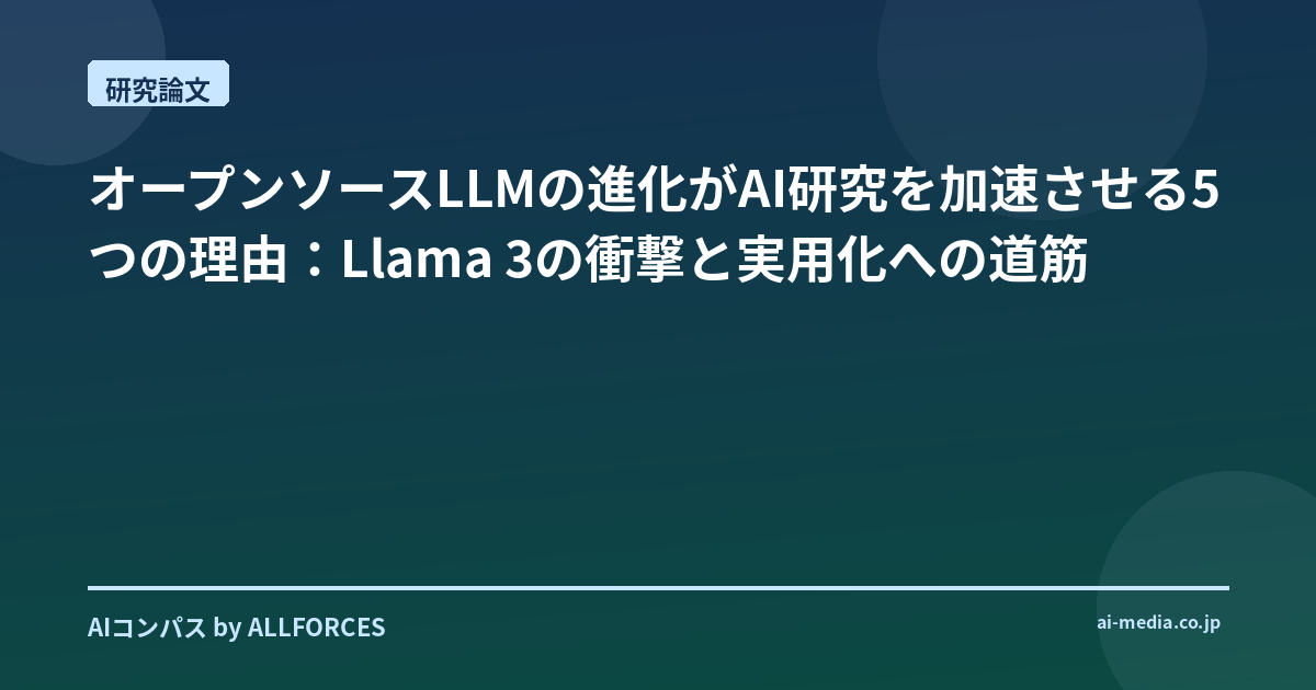 オープンソースLLMの進化は、単なる技術的な進歩に留まりません。それは、AI研究開発の「民主化」を加速させていると言えます。これまで一部の巨大企業に集中していたAI開発の力が、世界中の開発者や研究者に分散されつつあるのです。