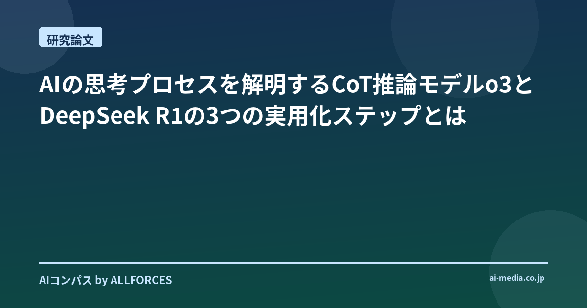 AIがますます高度化する中、その「思考プロセス」を理解し、より人間に近い推論能力を持たせるための研究が活発に進んでいます。特に、Chain-of-Thought (CoT) 推論モデルの登場は、AIの能力を一段階引き上げる可能性を秘めています。今回は、最新のCoT推論モデルであるo3やDeepSeek R1に焦点を当て、その技術的な深掘りと、AI研究における学術的な意義、そして実用化への道筋について、AI開発の現場からお伝えします。
