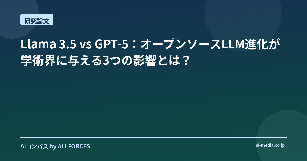 GPT-5がオープンソースとして提供される可能性は低いかもしれませんが、もしLlama 3.5がオープンソースで公開され、かつGPT-4oやGemini 3 Proに匹敵する性能を持つならば、学術界におけるLLM研究の様相は大きく変わるはずです。研究者は、より少ないリソースで最先端のモデルをベースにした実験を行えるようになり、イノベーションのスピードは飛躍的に向上するでしょう。