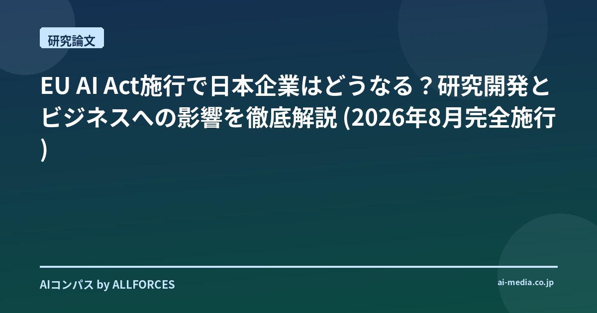 AI研究開発の現場に身を置いていると、技術の進化スピードに目を見張る日々ですが、同時に、その社会実装に向けたルール作りも急速に進んでいることを実感します。特に、2026年8月に完全施行されるEU AI Actは、日本企業にとっても無視できない存在です。今回は、このEU AI Actが、私たちのAI研究開発やビジネスにどのような影響を与えるのか、私の経験を交えながら考察していきます。