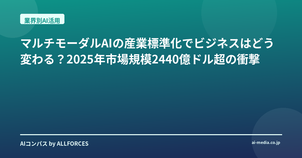 マルチモーダルAIは、テキスト、画像、音声、動画などを統合的に処理するAI技術の一種で、より高度な情報理解と生成を可能にします。2025年のAI市場規模が2,440億ドルに達すると予測されるように、この技術革新はビジネスのあり方を根本から変えつつあります。本稿では、マルチモーダルAIの市場背景、技術構造、そして実務への示唆という3つの観点から、その可能性と現実を探ります。